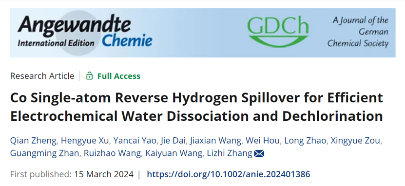 Distinguished Professor Zhang Lizhi and Associate Professor Yao Yancai's Groundbreaking Study in Angewandte Chemie Utilizing the Reverse Hydrogen Spillover Effect of Co Single-atom Catalyst for Electrochemical Water Dissociation and Dechlorination