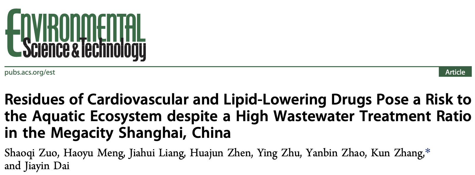 张琨副教授在ES&T发表研究成果阐释心血管和降脂药物在超大城市水系的污染状况及潜在生态风险