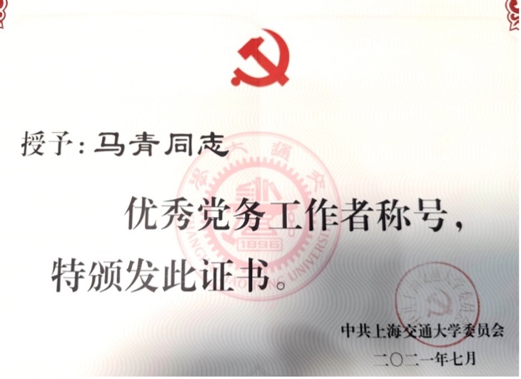 2021年,支部党员马青荣获香港AV 优秀党务工作者称号
