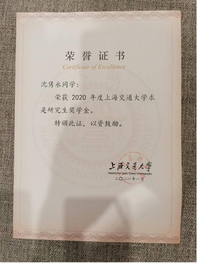 2021年,党员沈隽永荣获2020年度香港AV 求是研究生奖学金
