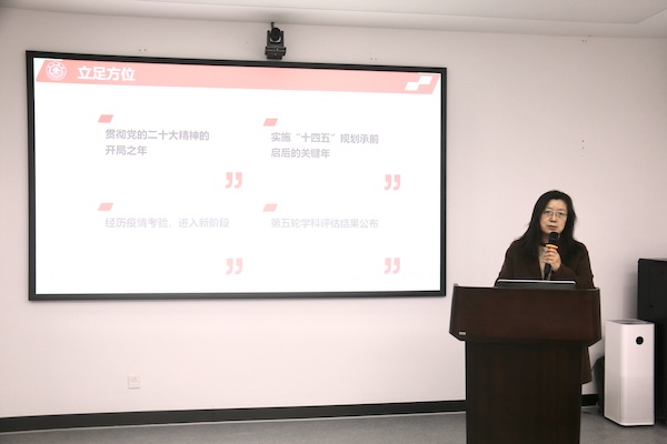 党委书记胡薇薇作2023春夏学期工作思考报告,传达学校2023年春夏学期干部大会会议精神及第十一届委员会第九次全委会报告精神,并从党建工作、人才培养、学生全面发展健康成长、师资队伍建设、谋划学科新一轮发展、推进有组织科研、提升办学声誉、新大楼搬迁等方面对2023年上半年学院重点工作进行部署。她强调,2022年,在学校党委坚强领导下,学院全体教师同心协力打赢疫情防控阻击战,奋发有为推动各项事业稳健发展;2023年,是全面贯彻落实党的二十大精神的开局之年,是实施“十四五”规划承前启后的关键之年,在把握新时代新要求、立德树人根本任务和人才强院主战略背景下,全体教师要更加凝心聚力、锚定目标,加速追赶、持续攻坚,充分利用好新大楼新空间,助力学院各项事业呈现新面貌,取得新发展。