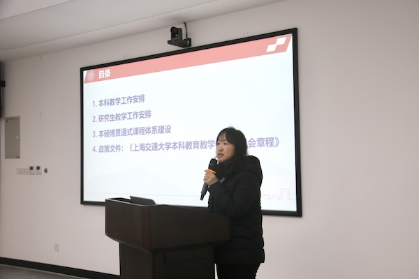 副院长刘萍介绍了春夏学期教学工作安排,围绕本科和研究生课程教学、“本硕博”贯通式课程体系建设和人才培养等重点工作进行细致部署,针对课程思政、教学秩序等问题予以工作提醒,并介绍了学校本科教育教学质量保障体系相关规章。