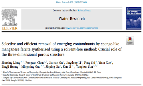 近日,香港AV 贾金平团队在环境领域著名学术期刊Water Research上发表了题为“Selective and efficient removal of emerging contaminants by sponge-like manganese ferrite synthesized using a solvent-free method: Crucial role of the three-dimensional porous structure”的研究论文。