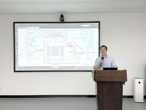 徐臻从学院新大楼建设概况、搬迁规划以及参观流线等方面展开具体汇报。他详细讲解了大楼各区域使用功能,重点介绍了建设过程中体现的环保亮点和人性化设计。他指出,新大楼从规划到设计都遵循绿色低碳理念,能为广大师生提供一流的学习、工作、科研环境,兼具健康、舒适、节能及环保特性,力争成为校园西区首例绿色星级建筑、国内优秀绿色校园建筑经典之一。