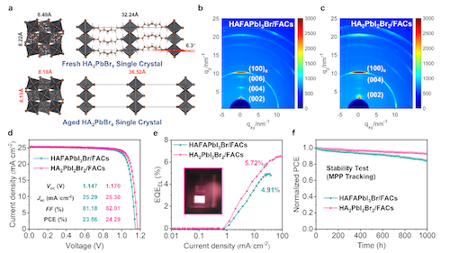 近日,香港AV 光电能源和资源化学团队在国际知名期刊Journal of the American Chemical Society发表了关于稳态与亚稳态低维钙钛矿的最新研究成果:“Myth behind Metastable and Stable n-Hexylammonium Bromide-Based Low-Dimensional Perovskites”。该工作研究钙钛矿光电薄膜钝化中常用的正己基溴化铵(n-Hexylammonium Bromide, HABr)修饰分子的钝化机制,通过对基于HABr的二维钙钛矿的理化性质的探究,厘清了正己基溴化铵基二维钙钛矿的稳定化机制,并在理论指导下构筑了HABr基二维钙钛矿钝化的具有三维结构和热力学稳定的FA-Cs钙钛矿太阳能电池,取得了24.29%的高光电转化效率和长期运行稳定性。该工作为理性设计低维钙钛矿的晶体结构及其光电应用提供了系统的解析与指导。