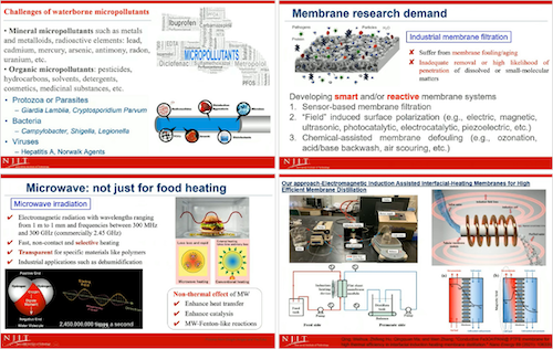 微量污染物对人体健康和环境状况具有很大威胁,目前的研究包括金属及类金属等矿物微污染物、有机微污染物、环境微生物等等,很少有经过实践验证的低成本和稳定的技术能过够去除水体中的微污染物。膜分离技术因其高通量、膜和其他配件成熟的生产线、调节组装和部署等优势,在能源、水处理、制药和化工等各个领域得到了广泛应用。然而,膜分离技术存在着诸如污染物沉积、浓差极化和膜老化等固有缺点,限制了基于膜的过程的应用。基于此,张文教授介绍了团队开展的各类膜工艺或技术的研究活动,主要包括光催化反应膜、电化学膜、微波辅助抗污染与反应性膜过滤、电磁催化与集成、纳米尺度原位膜表征。为克服传统膜过滤系统的固有限制,张文教授重点介绍了团队研究和评估的三种主要反应膜体系(光催化反应膜、微波辅助反应膜和电化学反应膜)。通过不同机制下的强化,有效解决了膜组件过滤中的堵塞、沉积等问题。与3M、Sterlitech等制造商的合作经历,也为听众提供了科学研究和工业应用相结合的策略见解。