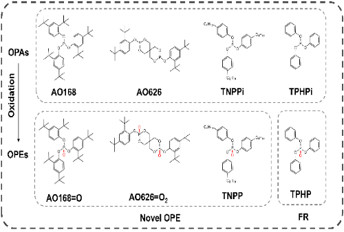 近年来的一些重要研究发现,OPAs是OPEs污染的重要间接来源。作为塑料和橡胶生产中的辅助抗氧化剂,OPAs在全球的消费量很高达4.0 × 104 Mg (2013)。OPAs通过分解过氧化物和捕获自由基来延缓聚合物的老化反应,并转化为氧化衍生物OPA=O(即OPEs)。OPA=O包括无已知直接来源的新型OPEs (NOPEs) 以及同时作为阻燃剂已广泛使用和研究的传统OPEs。近年已有研究在产品材料和接近排放源的环境中检测到不同浓度的OPAs。外场实测研究发现环境中存在较低浓度的OPAs,但检测到了可能由OPAs转化而来的NOPEs,其赋存水平和丰度甚至高于以往广泛关注的传统OPEs。这表明在自然环境条件下OPAs的稳定性极差,仅通过实验监测难以评估OPAs对OPEs环境污染贡献。