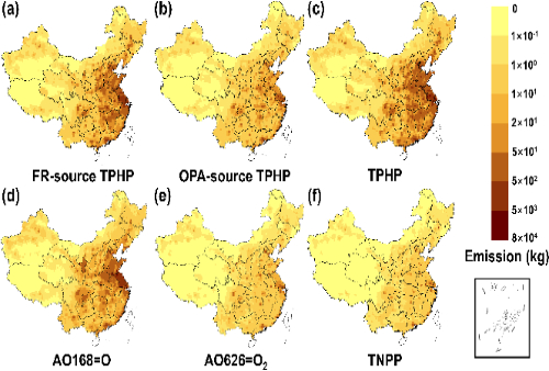 图2揭示了四种目标OPEs在中国的年排放量变化趋势。结果表明,TPHP在2010-2021年期间的排放量最高,为122~360 Mg/yr,其中约有一半排放来自其前体物TPHPi的转化(79-181 Mg/yr),这意味着在过去的研究中极大低估了OPAs的间接源贡献。对于三种NOPEs而言,AO168=O的排放量最高(169-283 Mg/yr),与TPHP相当。在四种目标OPEs中,TPHP年排放的平均增长速率最快,约为10%每年,其中在2016年增长速率达到了24%的峰值,这可以归因于中国自2014年起开始逐步禁用多溴联苯醚的使用。图3揭示了排放的空间分布,总体而言,中国东部和南部经济发达地区以及一些省会城市的排放量较高。其中值得注意的是,宁夏、山东、江苏和河南等地由于农用地膜覆盖率较高而成为AO168=O排放的热点地区。