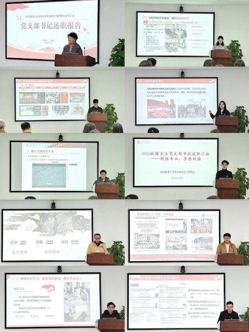 各党支部书记的述职评议考核采取“调研自查”与“现场述职评议”相结合的方式进行。各党支部书记对照要求,开展调研自查,形成述职报告,并向学院党委进行现场述职。在现场述职环节,两位教工党支部书记和八位学生党支部书记从理论精神学习情况、落实党建责任情况、支部标准化规范化建设情况、推动党建工作与主责主业深度融合情况、整改落实情况等方面,全面介绍了过去一年中支部党建工作取得的成果和存在的问题。