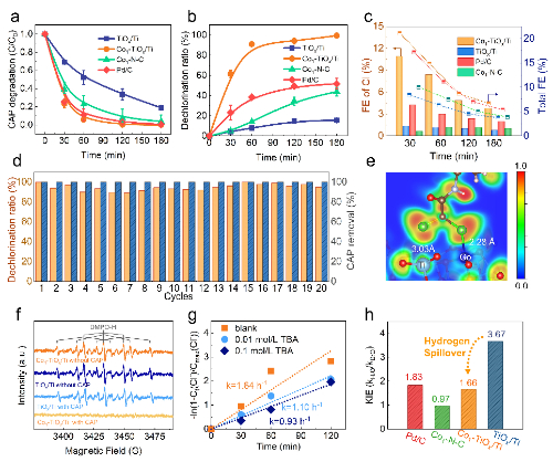 该团队使用氯霉素(CAP)作为模型污染物,测试了Co1-TiOx/Ti的电化学脱氯活性。在 -1.0 V vs Hg/HgO的条件下反应3小时后,Co1-TiOx/Ti的CAP脱氯比例可以达到99%以上,超越商业Pd/C(51%)、Co1-N-C(43%)、TiOx/Ti(10%)。相较其他对照样,Co1-TiOx/Ti在CAP的脱氯过程中还表现出最高的法拉第效率,并且在20轮电解反应(60小时)中保持脱氯比例在90%以上。该团队在脱氯机理研究中,利用电子局域函数、EPR、叔丁醇猝灭实验、H/D动力学同位素实验证明TiOx/Ti 是脱氯过程主要的水解离位点,而单原子Co位点既能高效地吸附CAP的C-Cl键,同时也通过反向氢溢流效应让TiOx/Ti基底的H*更快地参与到脱氯反应中。