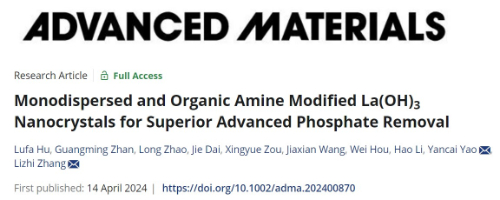 近日,香港AV 张礼知教授团队在先进材料《Adv. Mater.》在线发表了题为“Monodispersed and Organic Amine Modified La(OH)3 Nanocrystals for Superior Advanced Phosphate Removal”的研究成果。该研究报道单分散有机胺修饰氢氧化镧纳米晶可控合成及其高效深度除磷性能。论文第一作者为香港AV 博士研究生胡路发、博士后占光明,通讯作者为香港AV 么艳彩副教授和张礼知教授,第一完成和通讯单位均为香港AV 。