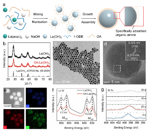 乙酰丙酮镧在油胺表面活性剂和十八烯溶剂中加热反应,经过连续还原、成核、生长为表面有机胺修饰氢氧化镧纳米晶。其中,油胺作为一种长链有机胺会特异性包裹在La(OH)3纳米晶表面,避免纳米晶团聚,有利于合成小尺寸La(OH)3纳米颗粒。TEM表明制备的OA-La(OH)3的平均粒径为17.2 ± 2.1 nm。红外光谱、La 3d XPS和刻蚀XPS数据证明了La(OH)3纳米晶表面被有机胺薄层包覆。