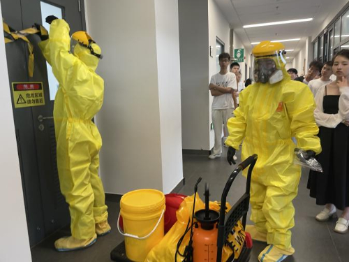当天下午,在学院409实验室,以“500毫升硫酸不慎打翻,少量液体溅入眼睛”为情景,从情景状态、应急任务、现场决策、应急行动和救援处置等方面开展全流程实战应急演练。演练过程中,师生们沉着冷静、密切配合,出色完成了人员救护、紧急疏散、现场封锁、事故逐级上报、应急救援等各个环节,有效强化了师生们的快速应急安全处置能力。