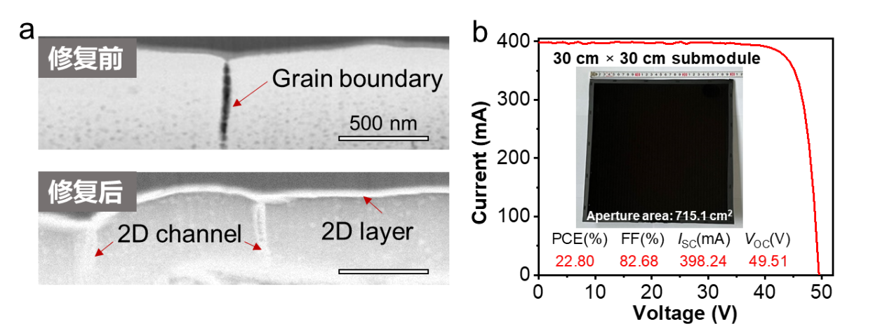 图2 杂质修复后的钙钛矿薄膜及大面积高效率模组