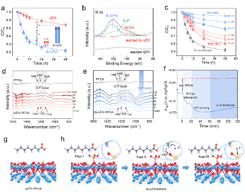 以全氟辛酸(PFOA)为目标污染物,该团队评价了Si-nZVI在氩气氛围下的脱氟性能。Si-nZVI能在48h内去除96%的PFOA,且脱氟率高达92%,而nZVI仅能去除34%的PFOA,脱氟率为11%。反应后样品表征结果显示,F以Si-F键的形式存在于Si-nZVI表面,说明Si-nZVI在实现脱氟的同时,也实现了F的固定,降低了F二次污染风险。利用原位红外耦合电化学开路电位的方法监测了脱氟反应过程,nZVI/PFOA反应中红外光谱与开路电位均无明显变化,说明nZVI与PFOA无明显电子转移过程;Si-nZVI/PFOA反应中,原位红外光谱与开路电位均出现了明显的三个阶段,可对应Si-nZVI去除PFOA的三个阶段:(1)Si-nZVI对PFOA的吸附,(2)Si-nZVI对PFOA的加氢脱氟,(3)Si-F键的形成。