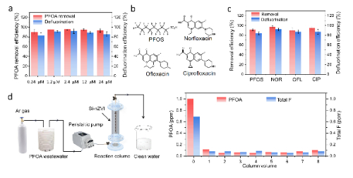 该团队还设计了填充有Si-nZVI的柱实验反应塔去除不同浓度的PFOA。结果显示Si-nZVI对0.24 - 24 μmol/L范围内的PFOA去除率达到90.1 - 96.2%,脱氟率达到75% - 92%。连续去除2.4 μmol/L PFOA模拟废水8个柱体积,PFOA去除率均在90%以上,出水中总氟含量均低于0.1 ppm。同时该新型零价铁对全氟辛磺酸,氟喹诺酮等其他含氟污染物均表现出优异的脱氟效果。该方法为实际含氟废水的深度处理提供了有前景的方案。