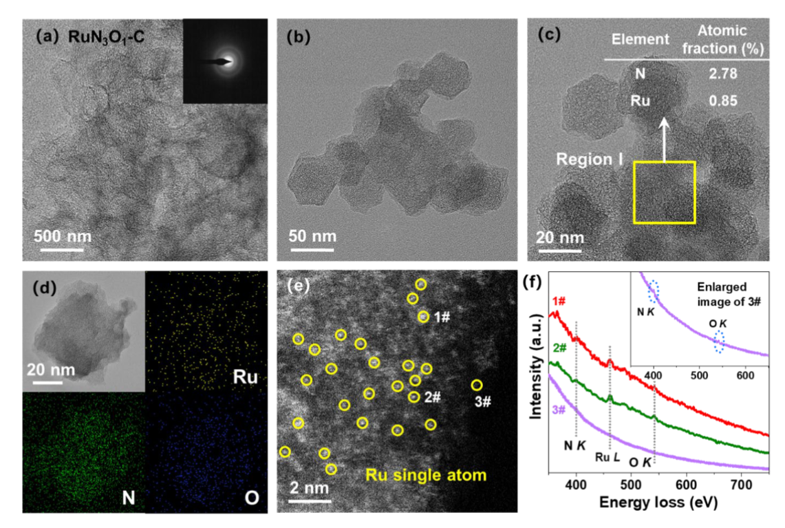 通过氧蚀刻策略合O/N共掺杂的Ru单原子催化剂,以调控其局部配位环境并提升催化性能。通过TEM和AC-HAADF-STEM图像揭示了催化剂的微观形貌和原子级分散的钌。核心结果表明,RuN3O1-C由随机堆叠的不规则六边形纳米片组成,且钌原子均匀分散在碳基底上,未形成金属纳米颗粒。此外,EDS和EELS分析进一步确认了Ru、N和O元素的均匀分布以及Ru与N、O的配位关系。这些结果为研究结论提供了重要支撑,证明了氧掺杂成功调控了钌的配位环境,为后续优异的催化性能奠定了基础。