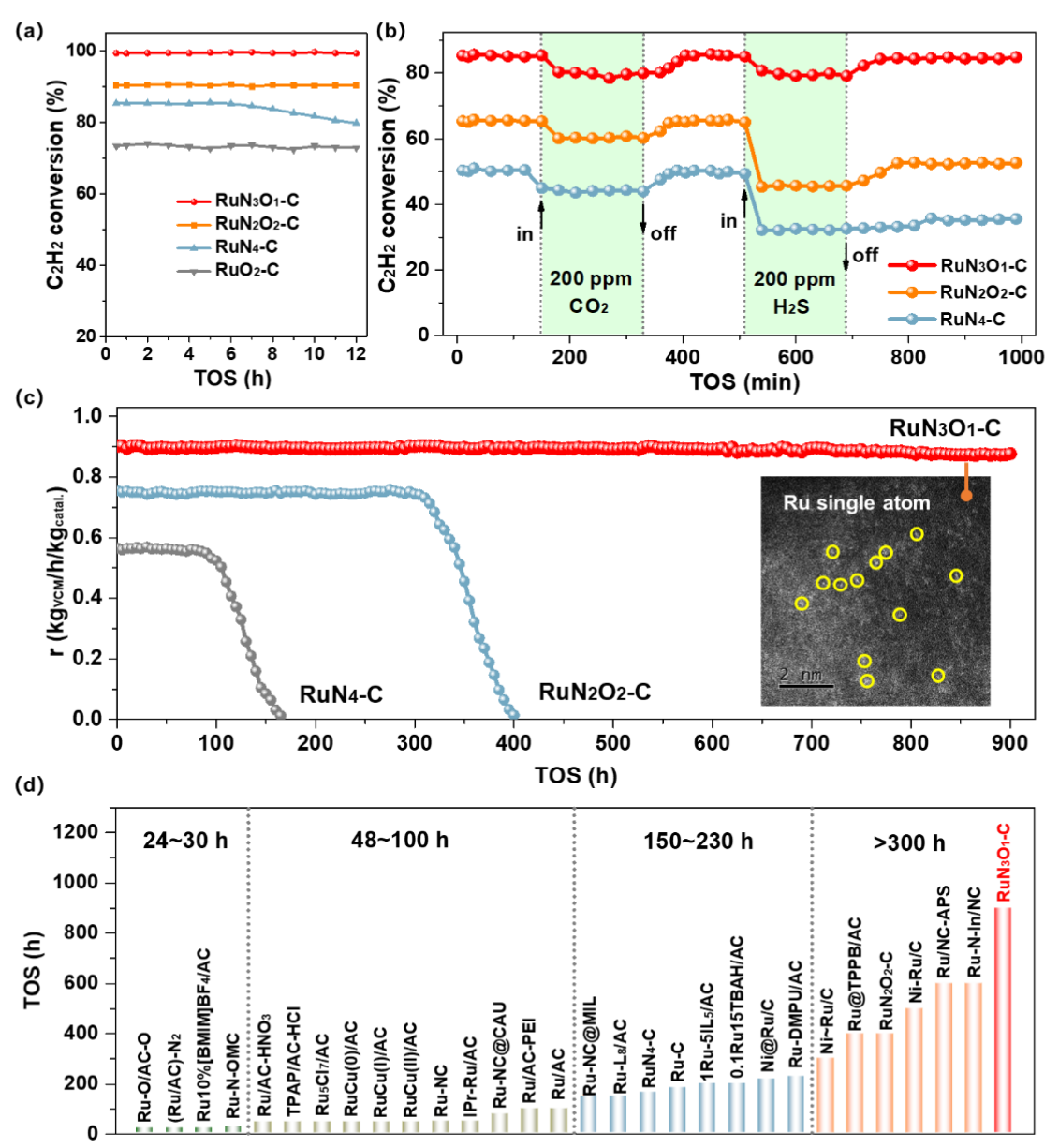 RuN3O1-C在反应中表现出超过99.4%的乙炔转化率和超过900小时的稳定运行时间,显著优于其他对照催化剂。此外,催化剂在含有杂质气体(如CO2和H2S)的条件下仍能保持活性,表现出优异的抗中毒能力。这些结果直接证明了氧掺杂策略的成功,为开发高性能单原子催化剂提供了有力证据。