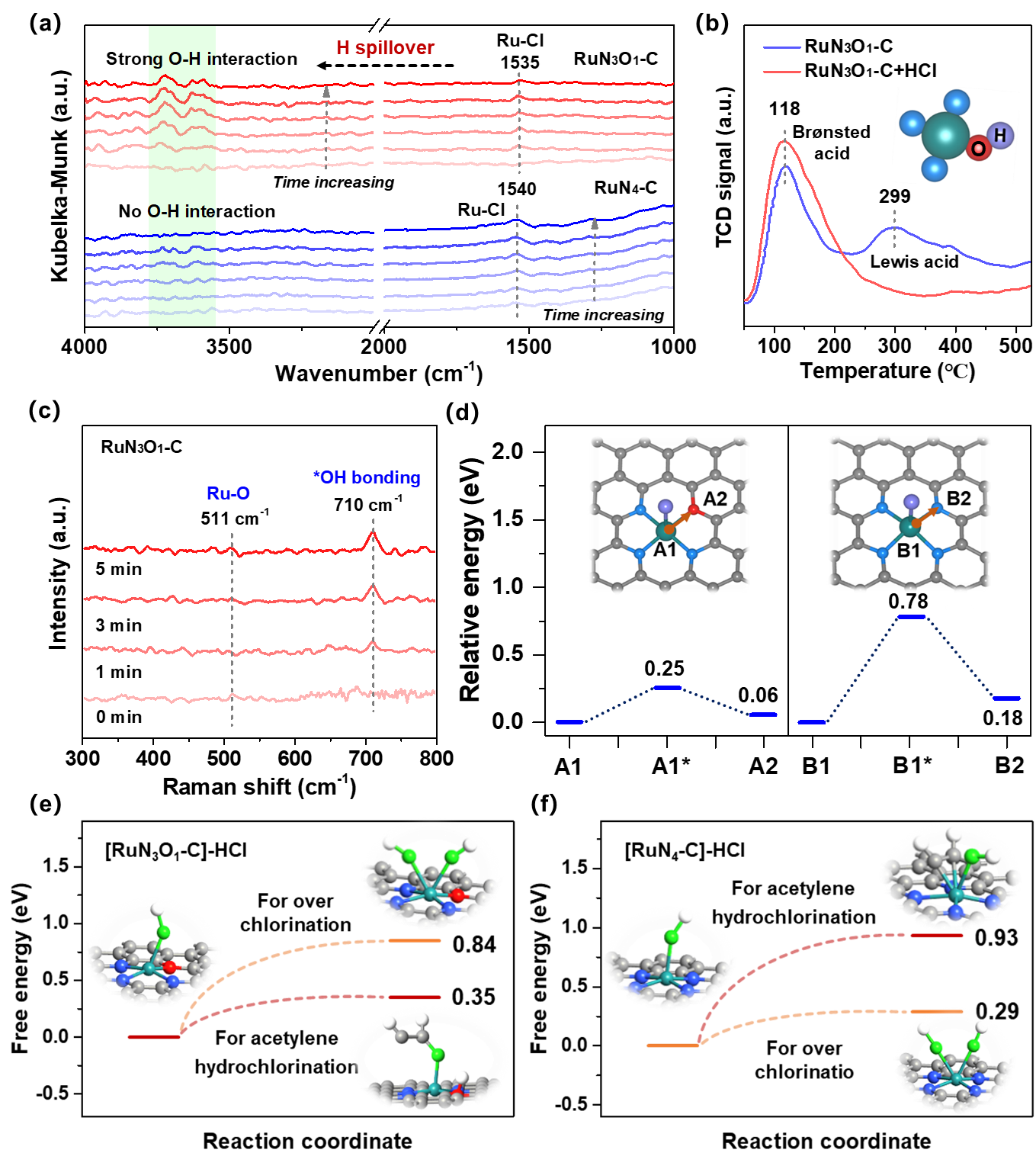 通过原位光谱技术和理论计算揭示氧掺杂如何通过氢溢流机制降低反应能垒。核心结果包括DRIFTS和NH3-TPD实验,证实了氧掺杂催化剂中存在从钌到氧的氢溢流现象。此外,拉曼光谱分析进一步揭示了氢溢流过程中氧与氢的相互作用。理论计算表明,氢溢流显著降低了乙炔氢氯化的反应能垒,使其从传统的Langmuir-Hinshelwood机制转变为Eley-Rideal机制,并且氢溢流通过降低氯化反应的热力学驱动力来抑制过度氯化。这些结果对研究结论具有重要意义,揭示了氧掺杂催化剂优异性能的内在机制。