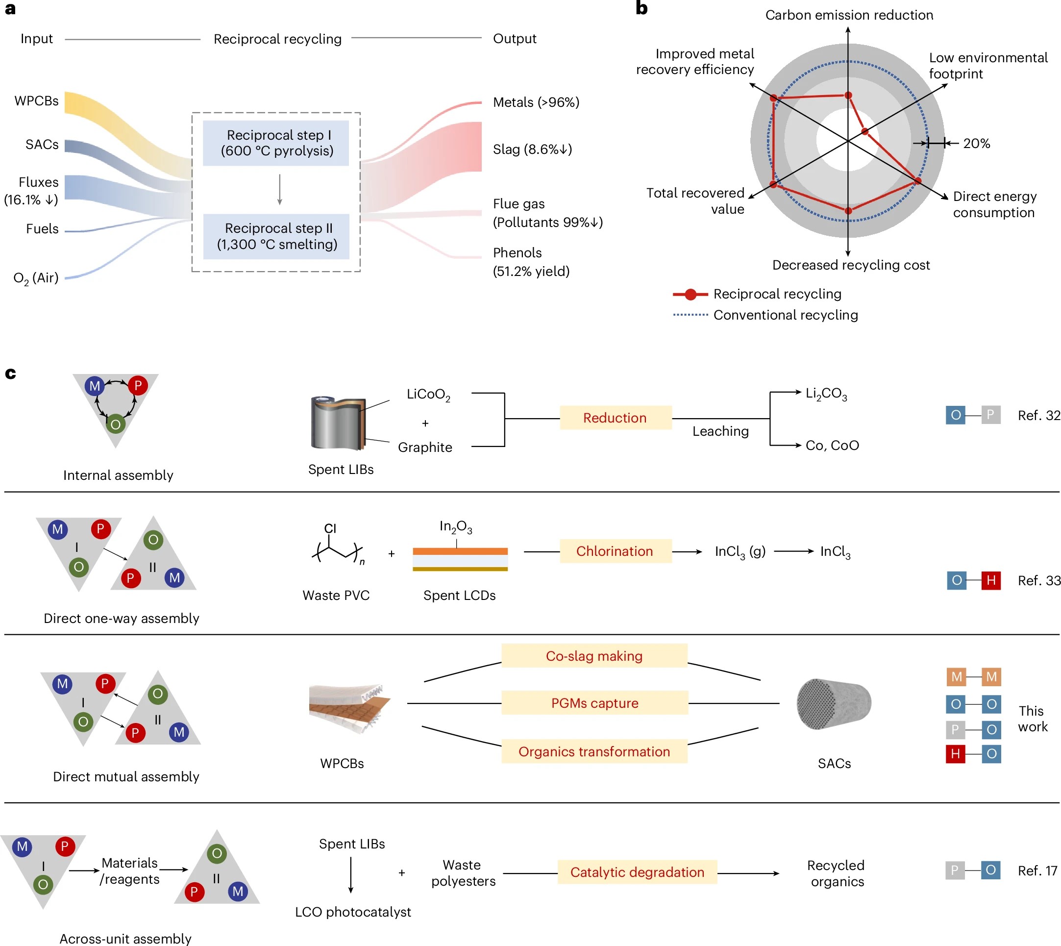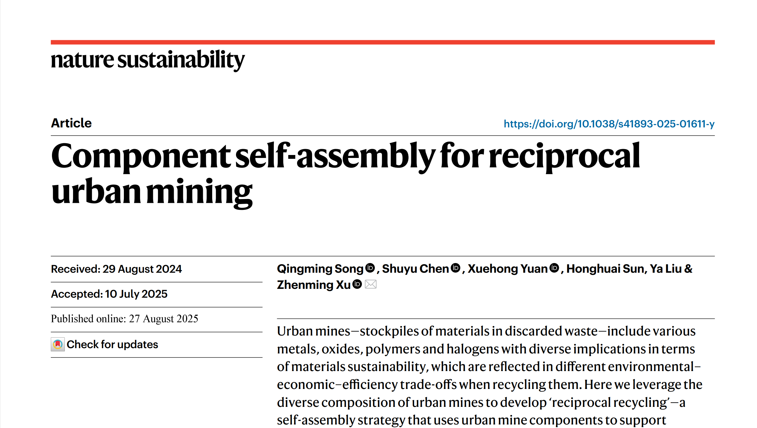 近日,香港AV 许振明教授团队在《Nature Sustainability》在线发表了题为“Component self-assembly for reciprocal urban mining”的研究成果。该研究提出了一种城市矿产组分自组装互惠回收策略,利用其组分多样性特征实现城市矿产的可持续互惠互助回收。香港AV 博士后宋庆明为论文第一作者,许振明教授为论文唯一通讯作者。本工作受到国家自然科学基金资助。