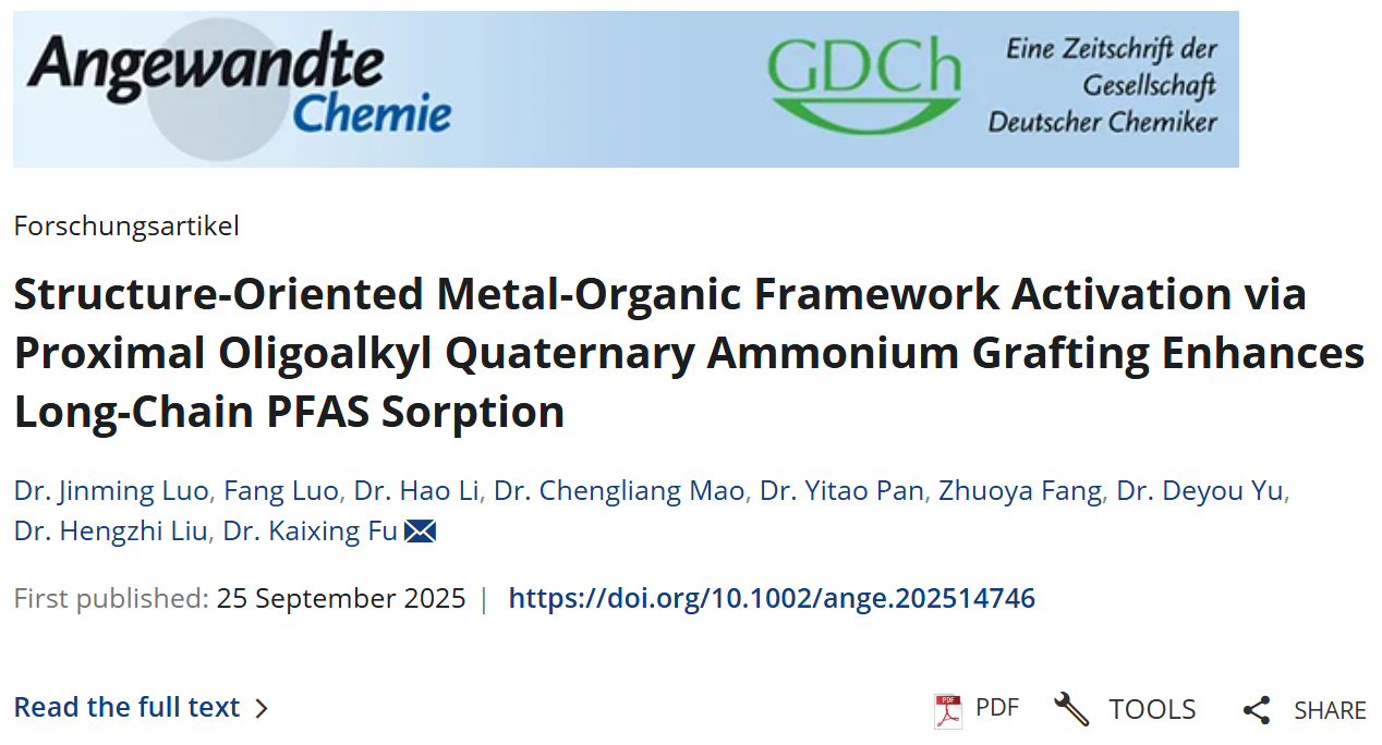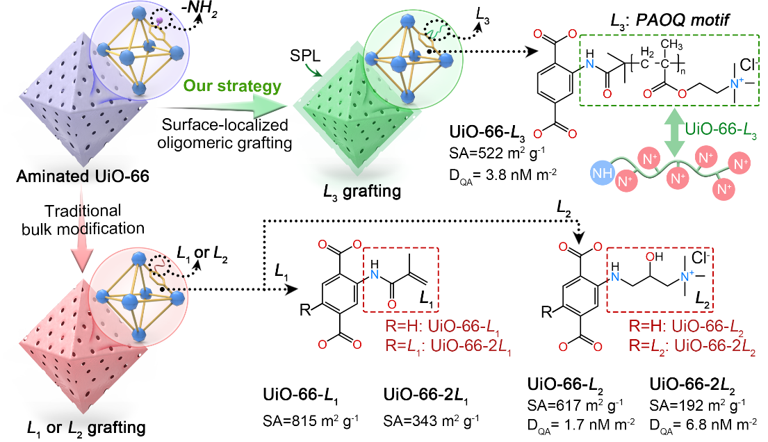 近日,香港AV 罗金明副研究员在《德国应用化学》(Angewandte Chemie)上发表了题为“Structure-Oriented Metal-Organic Framework Activation via Proximal Oligoalkyl Quaternary Ammonium Grafting Enhances Long-Chain PFAS Sorption”的研究成果。该研究成果突破传统MOF修饰局限,提出了一种表面局域化寡聚枝接策略,在UiO-66-NH₂表面精准构筑了邻近排列的寡聚烷基季铵盐(PAOQ)功能基元。该设计巧妙规避了MOF内部微孔的空间限制与传质壁垒,实现了功能基团负载量2.2倍的提升,并通过季铵盐与柔性烷基链的精确空间协同,实现了对长链PFAS的双模式高效捕获。