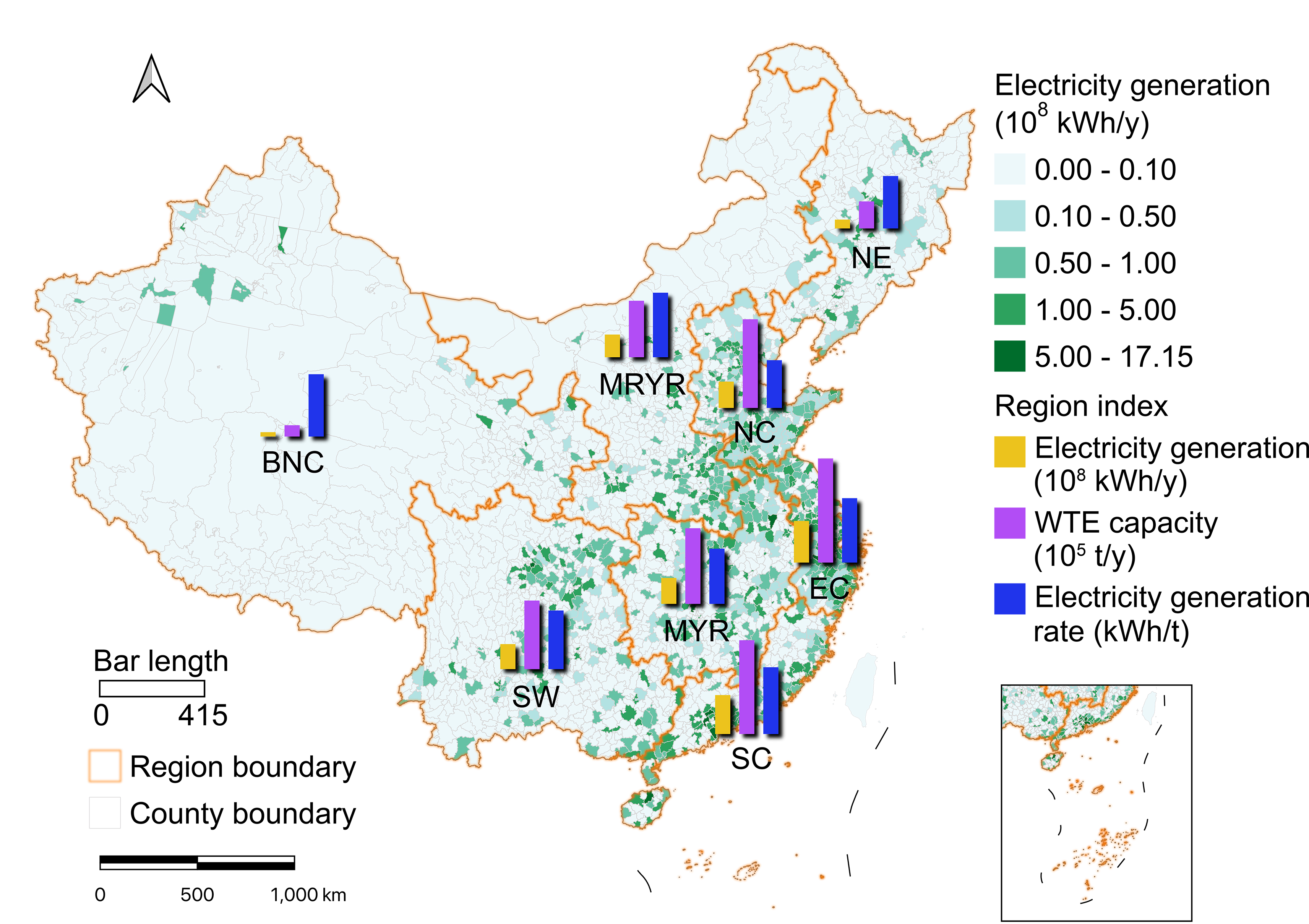 图1 我国垃圾焚烧厂处理能力、发电量地域分布