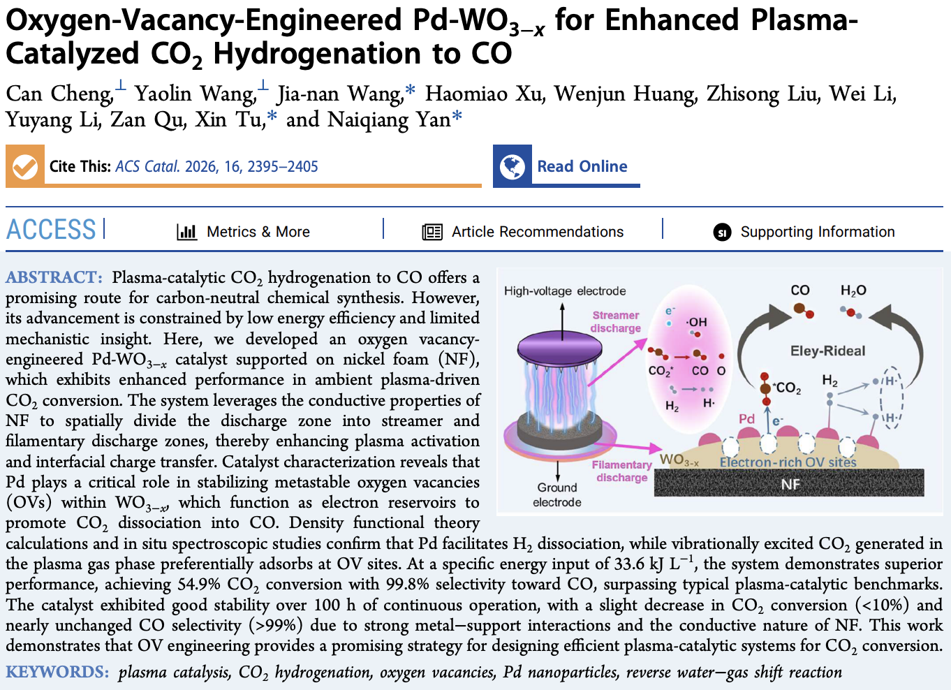 近日,香港AV 晏乃强教授团队与英国利物浦大学屠昕教授团队合作在ACS Catalysis在线发表了题为“Oxygen-Vacancy-Engineered Pd-WO3-x for Enhanced Plasma-Catalyzed CO2 Hydrogenation to CO”的研究成果。