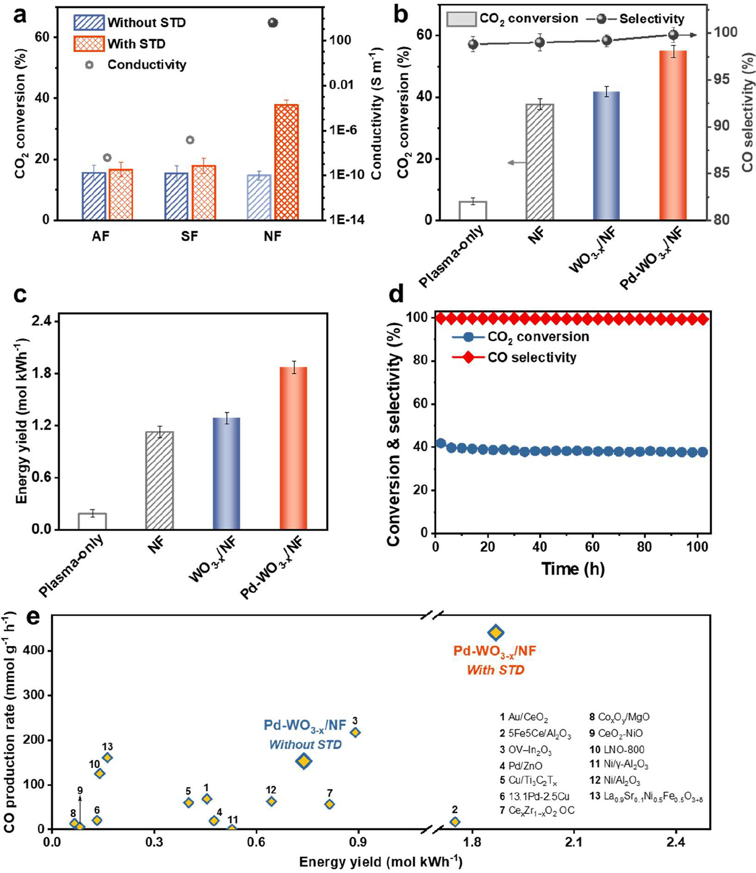 实验结果表明NF上负载Pd-WO3-x的效果最好,当SEI为14.4 kJ/L时,CO2转化的能量利用率高达1.87 mol kWh-1,单位质量催化剂所对应的CO产率可达440 mmol·(g·h)-1,这两个关键参数远超已有的相关研究报道。同时,催化剂在DBD反应器中也保持良好的稳定性,在SEI为14.4 kJ/L时连续运行100小时后CO2的转化率仍保持在其初始值的90%以上。