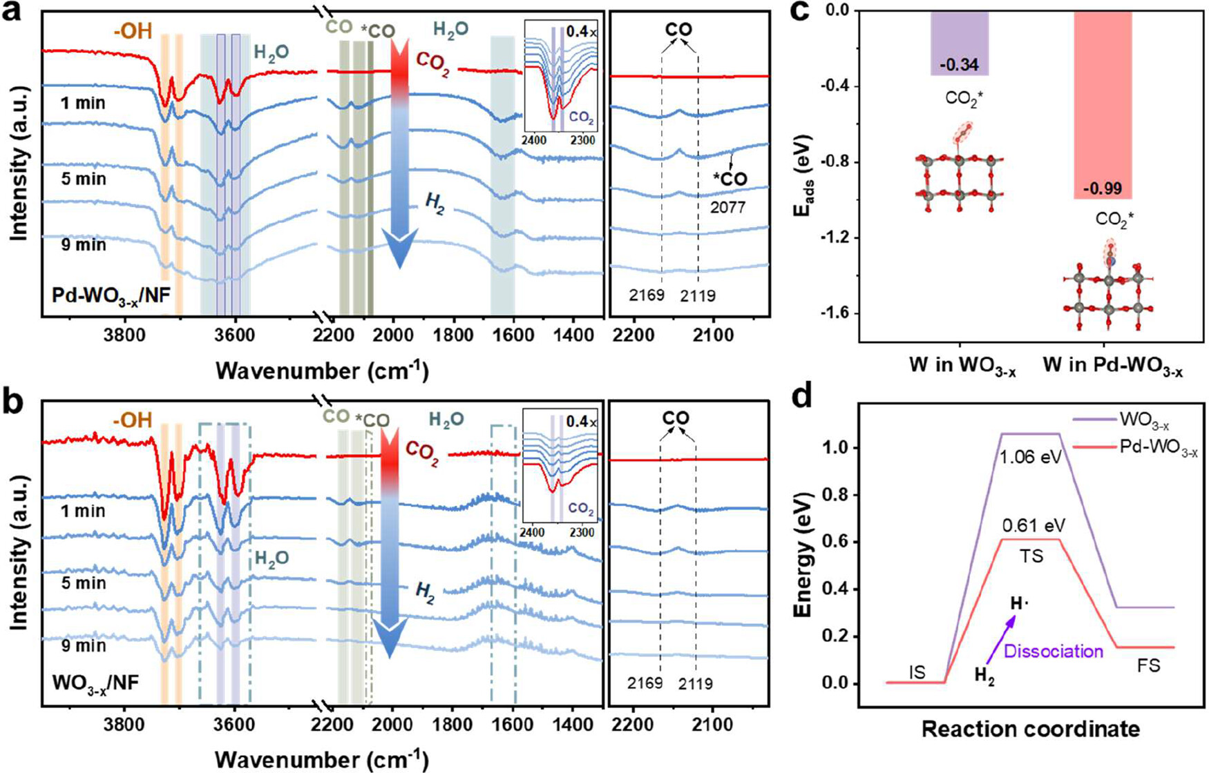 催化剂的结构表征结果显示,Pd引入WO3-x后所形成的梭状结构和多面体,明显增强了活性位点的暴露。Pd能稳定WO3-x中的亚稳态氧空位,从而促进催化剂表面的电子传递及H2与CO2的解离。原位等离子体红外光谱可清晰地捕捉到CO的直接生成;离子体产生的振动激发态CO2分子,优先吸附在催化剂丰富的氧空位位点上,另一方面,界面处显著的电荷转移(从Pd纳米颗粒流向WO3-x载体)增强了CO2的吸附与活化,协同氧空位共同削弱了C=O键,从而显著降低了CO2直接解离为CO的能垒。这二者的协同,使得振动激发的CO2得以与Pd解离出的H原子高效结合,经由Eley-Rideal机制生成最终产物CO。