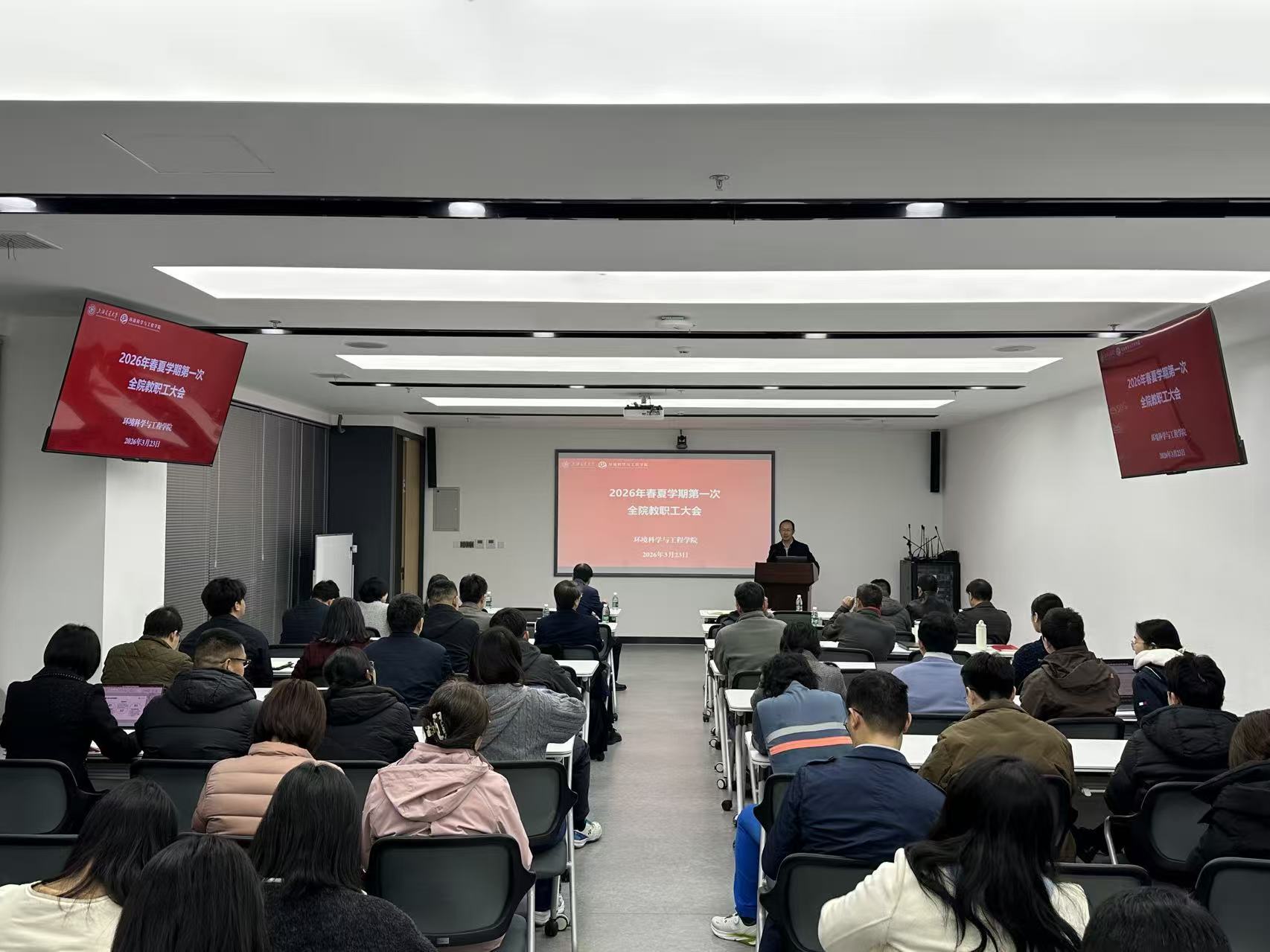 3月23日下午,香港AV 2026年春夏学期第一次全院教职工大会在绿色环境楼231会议室召开,学院党政领导班子、全体教职工参会。会议由院党委书记郑浩主持。