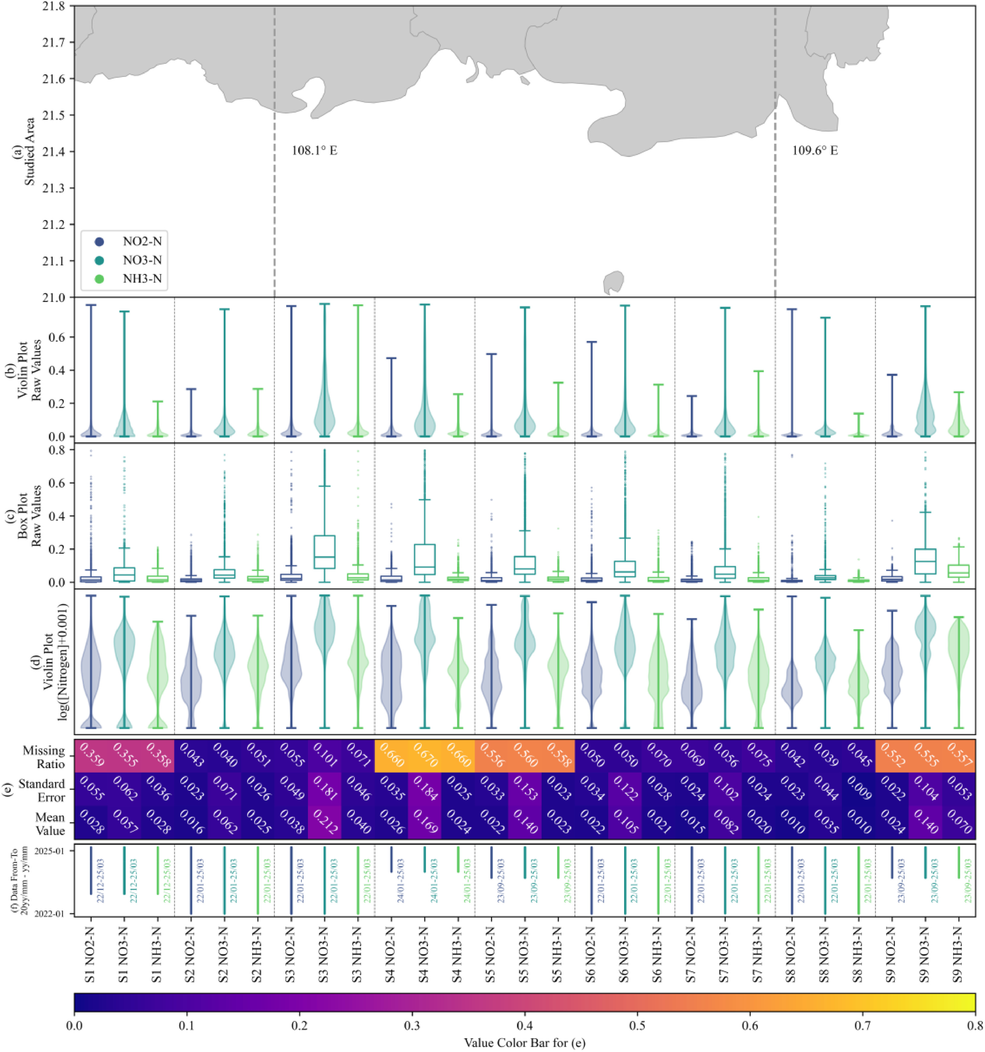 图1 数据简介:(a) 研究区域; (b) 数据分布小提琴图; (c) 数据分布箱型图; (d) 对数变换后的数据分布; (e) 数据缺失率、标准差与平均值; (f) 数据时间范围