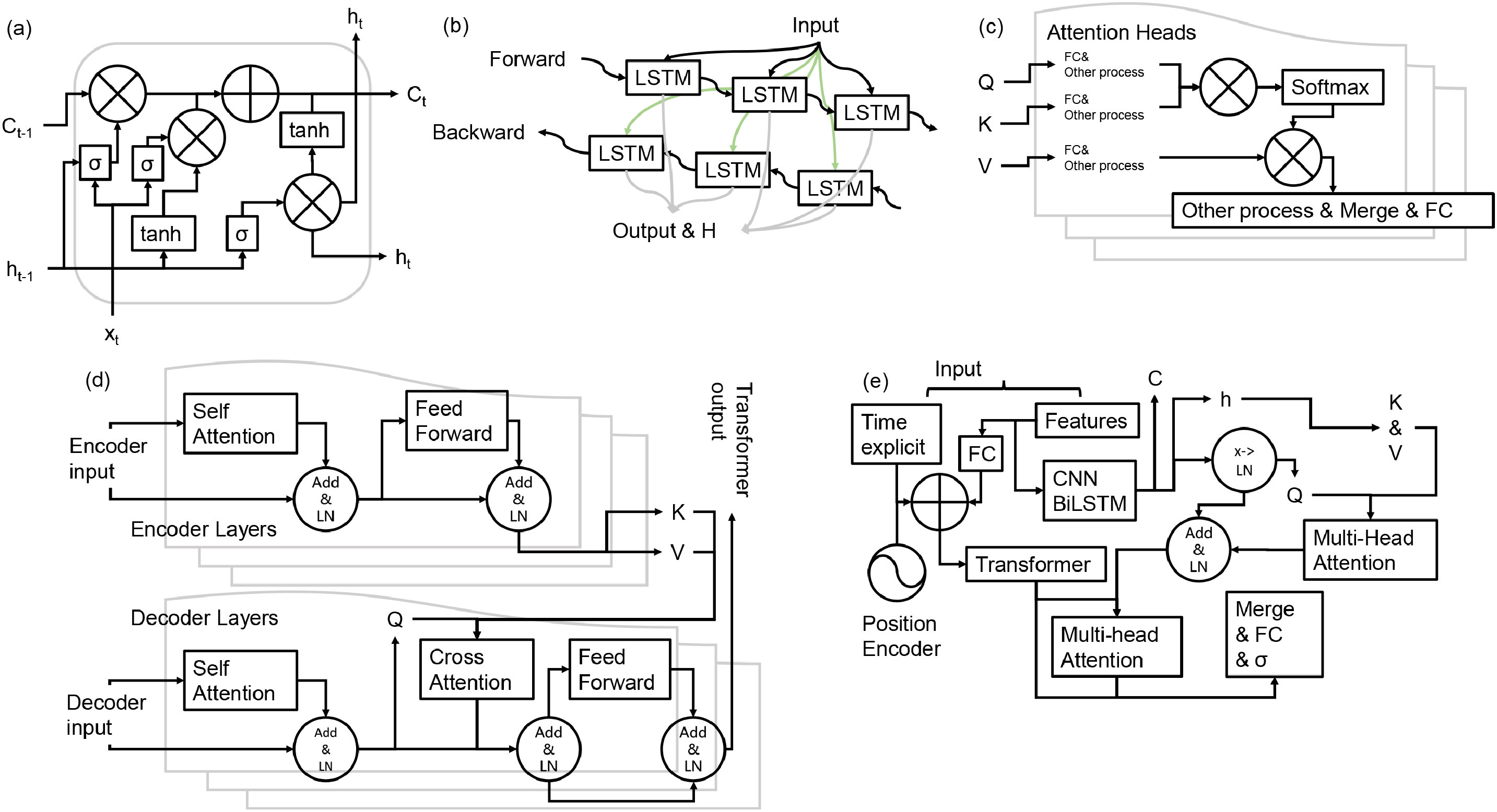 图2 模型结构:(a) LSTM; (b) BiLSTM; (c) 多头注意力机制; (d) Transformer; (e) AFTB