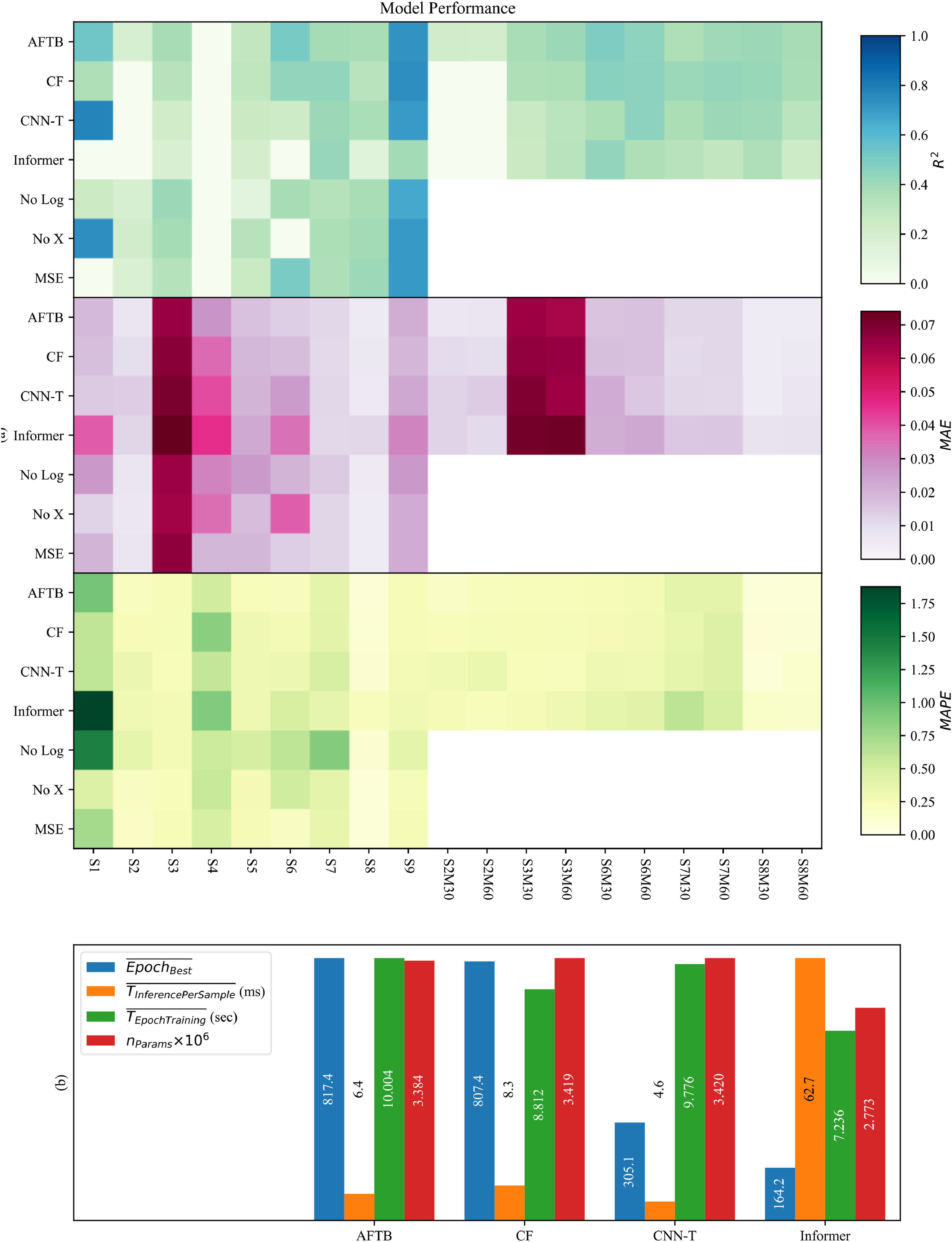 图3 (a) AFTB、基线模型与变体在各浮标站上的R2、MAE、MAPE表现热度图;(b) 归一化的计算效率指标比较