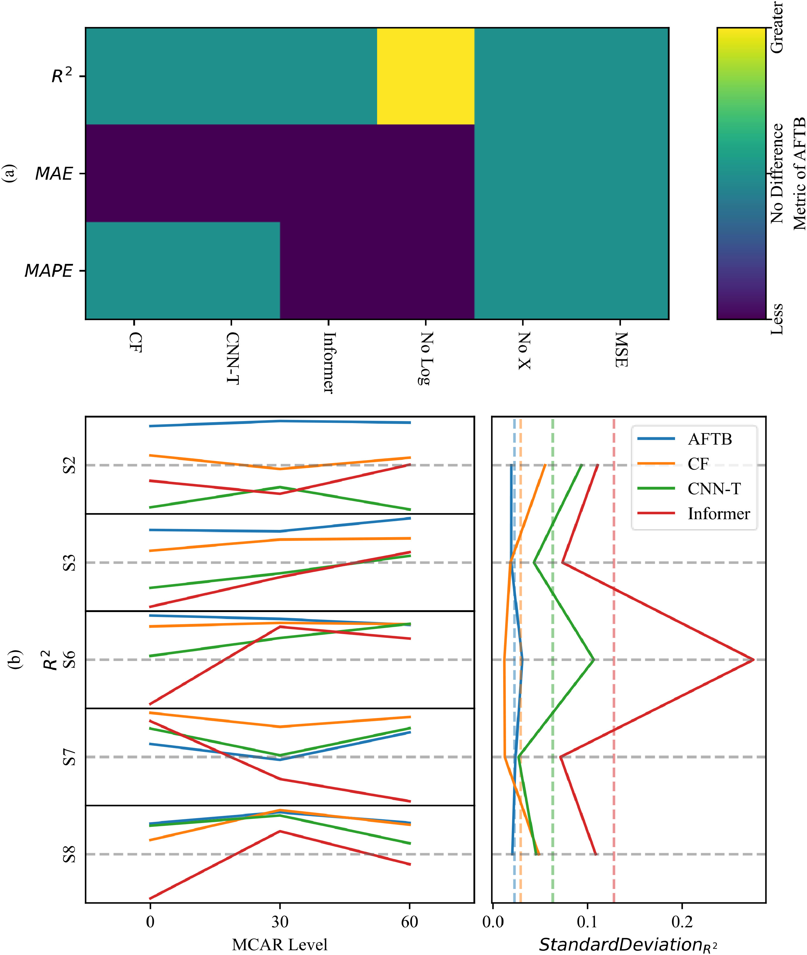 图4 (a) AFTB在R2、MAE、MAPE上相比其他6个变种的配对t检验显著性;(b) MCAR表现比较(左:各站点上的R2。右:对于一个站点的R2标准差)