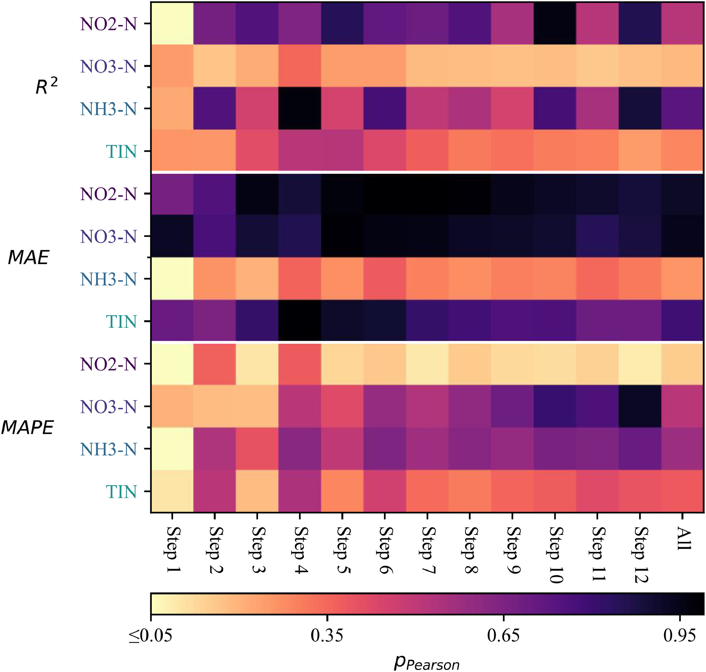 为研究站点数据自然缺失率是否与模型表现相关,将各站点上模型表现评价因子与缺失率进行了皮尔森相关性检验,结果证明相关性整体不显著(p > 0.05)。