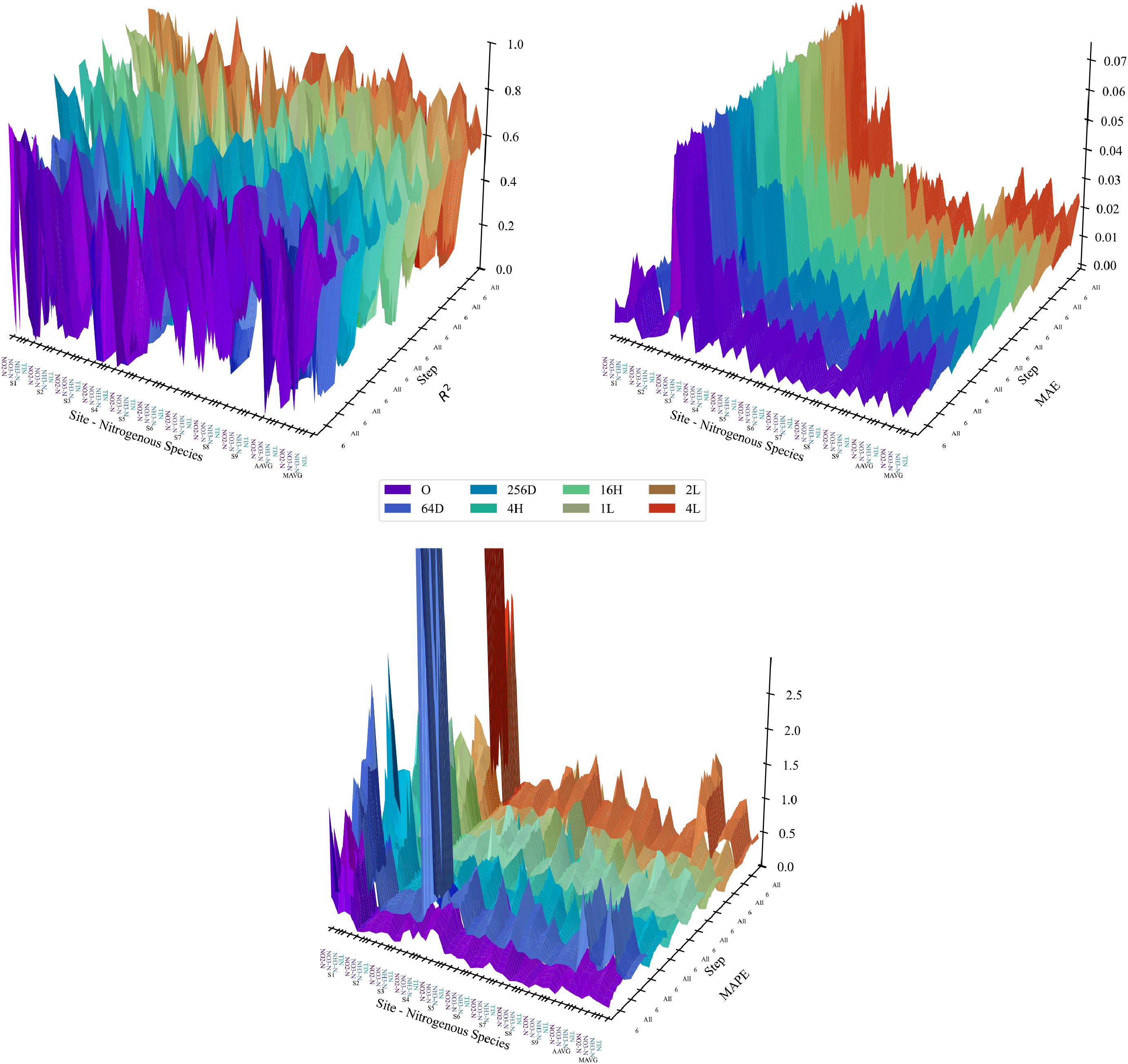 图6 超参数调节实验模型表现(R2、MAE、MAPE)三维面图