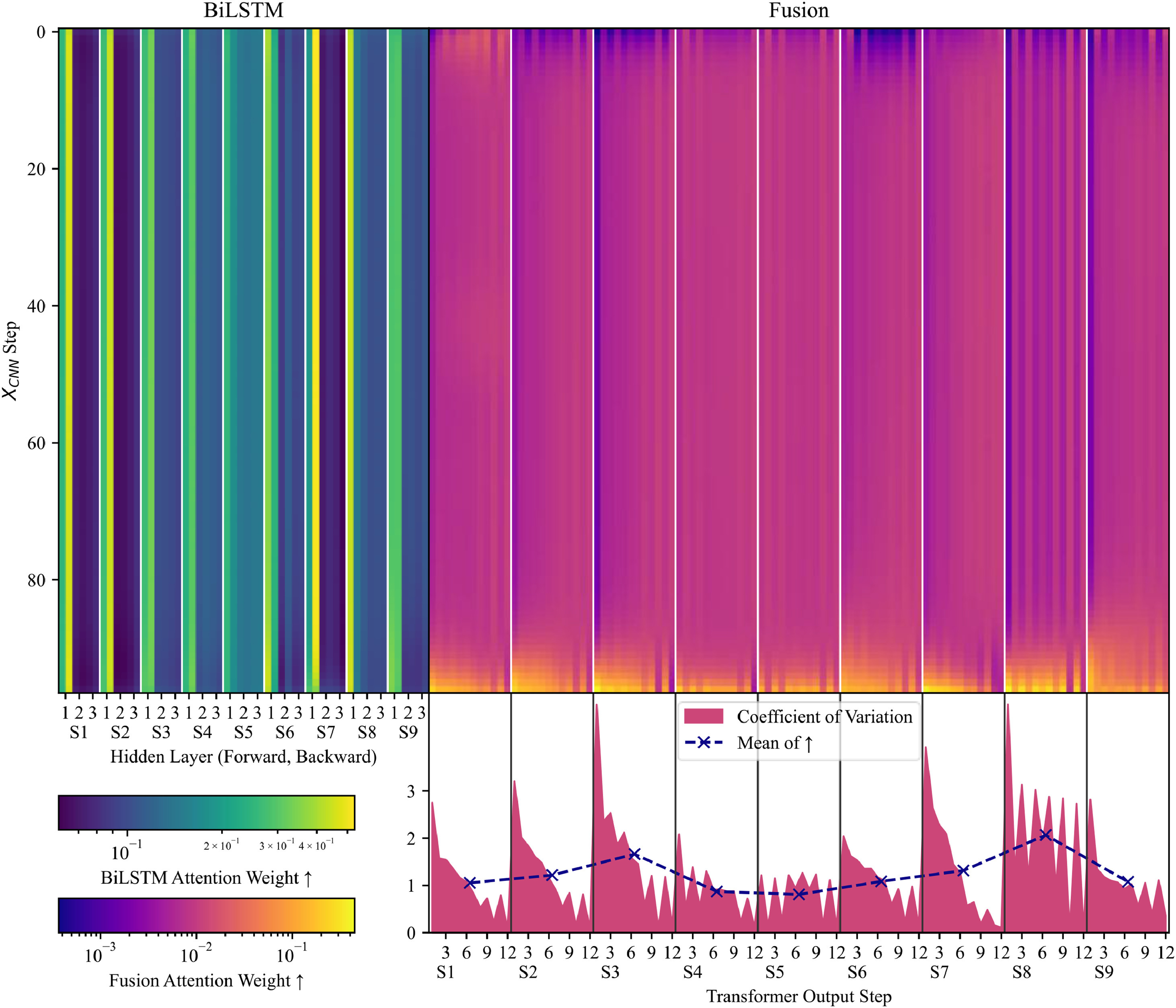 图7 BiLSTM注意力与融合注意力的权重以及融合注意力的各预测步变异系数