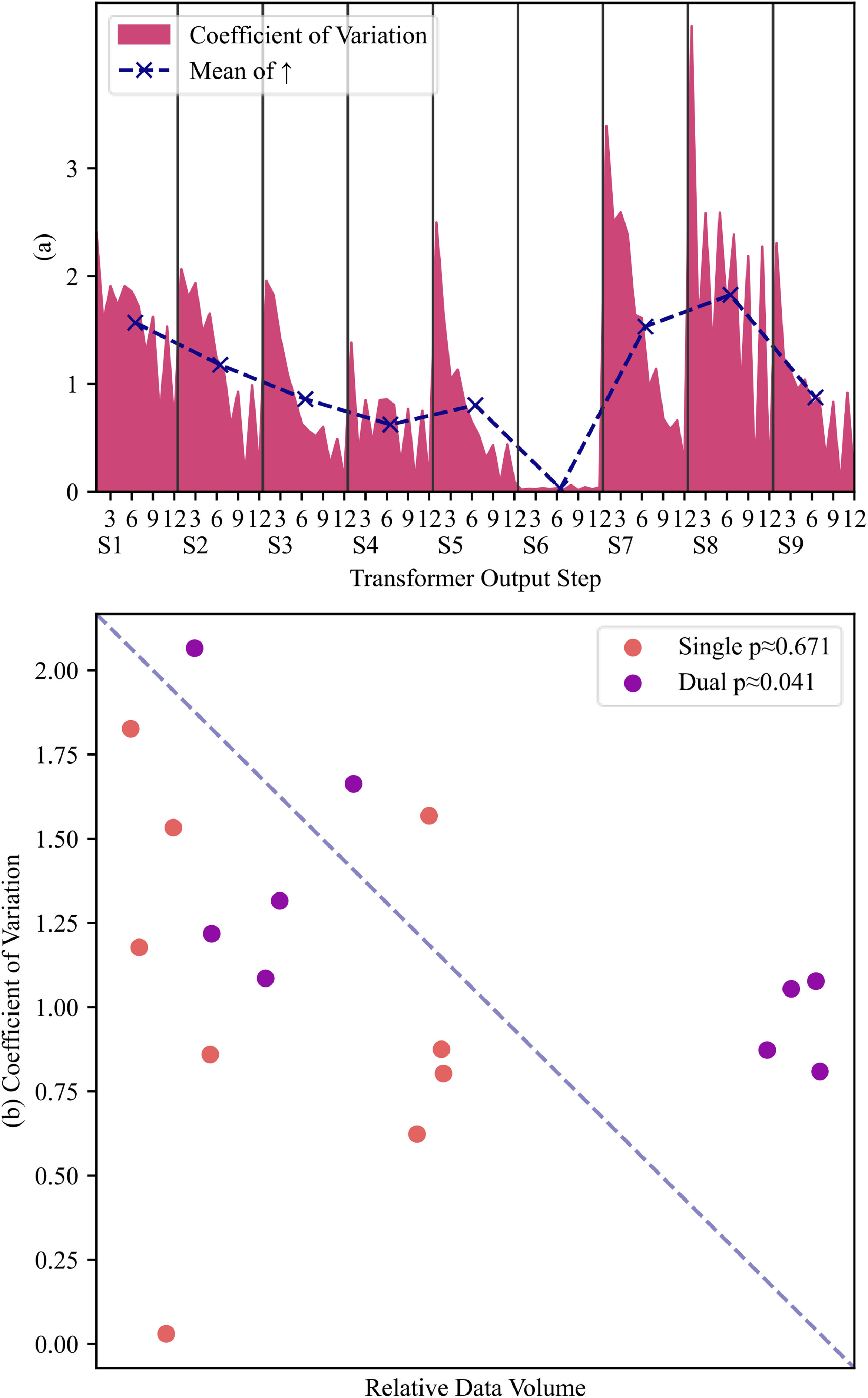 图8 (a) 去除非整点相位(Single)的各预测步变异系数; (b) 单相位与双相位(Dual)的变异系数与数据量的皮尔森相关性:单相位不显著,双相位显著