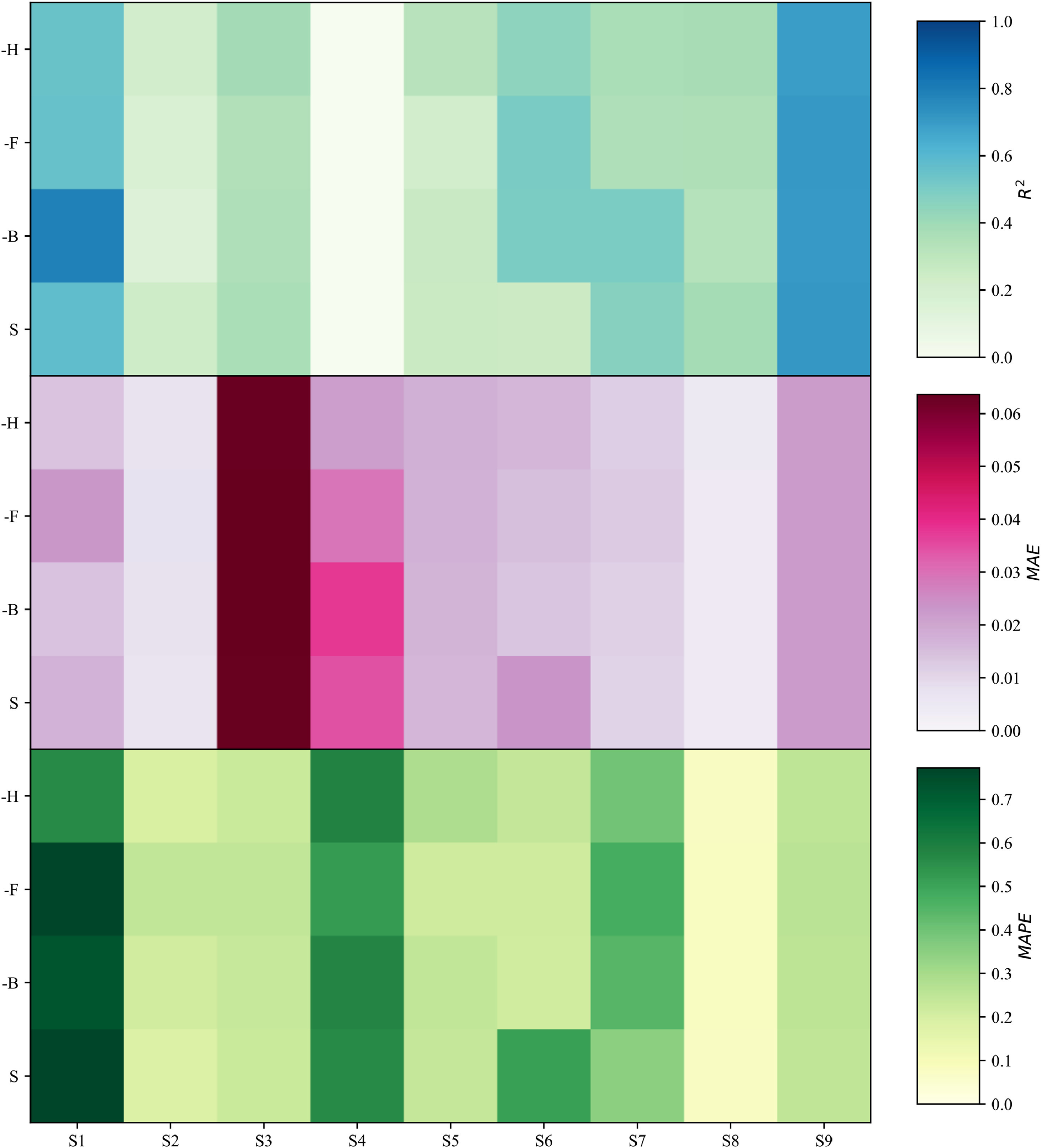各神经网络模型及训练策略的性能通过R2、平均绝对误差MAE和修正平均绝对百分比误差MAPE在9个浮标及12个预测步长(1–12步;“All”表示所有步长的汇总结果)上进行评估。结果分别采用9个浮标的算术平均值与合并均值进行汇总。为评估低数据完整性下的鲁棒性,本研究对5个本征缺失率较低的浮标(S2、S3、S6–S8)开展了完全随机缺失实验(MCAR)。针对每个浮标,将训练集随机减少30%(M30)或60%(M60)。四种算法(AFTB、CF、CNN-T、Informer)均在这些缩减后的训练集上训练,验证集与测试集保持不变。每个浮标在每个MCAR水平下仅生成一个数据副本。本研究所提出的AFTB与以下变体进行了对比:
