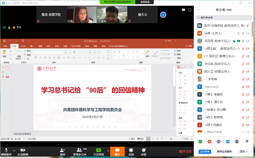 最后,院党委副书记陈哲总结。他回顾了党和国家及广大党员在抗击疫情中做出的努力与奉献,肯定了学生党员在防疫期间做出的贡献。呼吁各位学生党员要起到模范带头作用,向优秀的党员同志学习,用实际行动践行党员责任,坚守“环境人”的初心和使命。他还就当前国际舆论形势,提醒学生党员要保持清醒头脑、明辨是非,做到慎独、慎言。同时他鼓励学生党员要依托“学习强国”平台,积极主动线上学习,让学习成为一种习惯。并对《香港AV “学习强国”学习平台推广使用激励办法(讨论稿)》进行介绍,他希望各学生党支部支委、学习管理员要带头学习,营造浓厚的学习氛围和舆论氛围,支部要结合实际推出长期学习机制和考核激励制度,对学习突出的学生党员进行奖励。