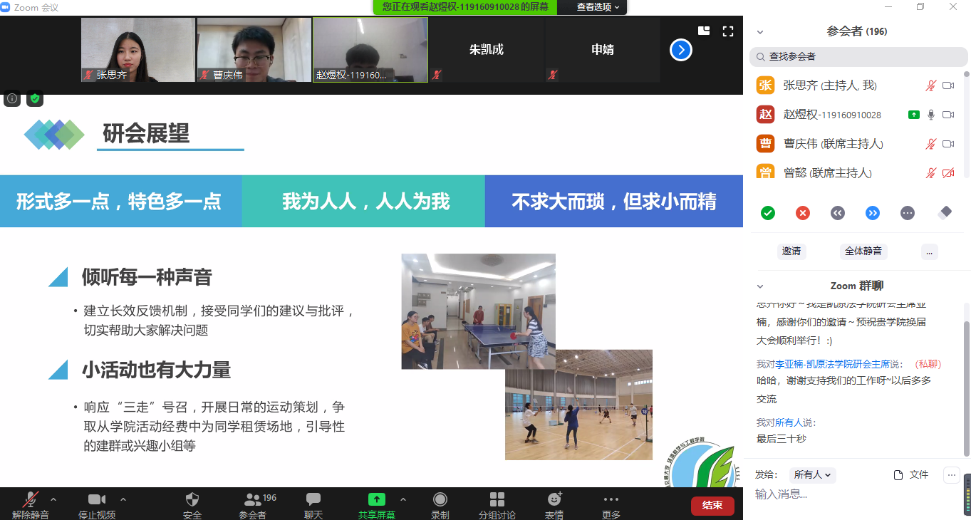 香港AV 校研究生会执行主席林云鹏同学为本次大会致辞,他肯定了香港AV 从广大师生群体的切身利益和需求出发举办的一系列学风学术和文体娱乐活动,并线上云合影留念。