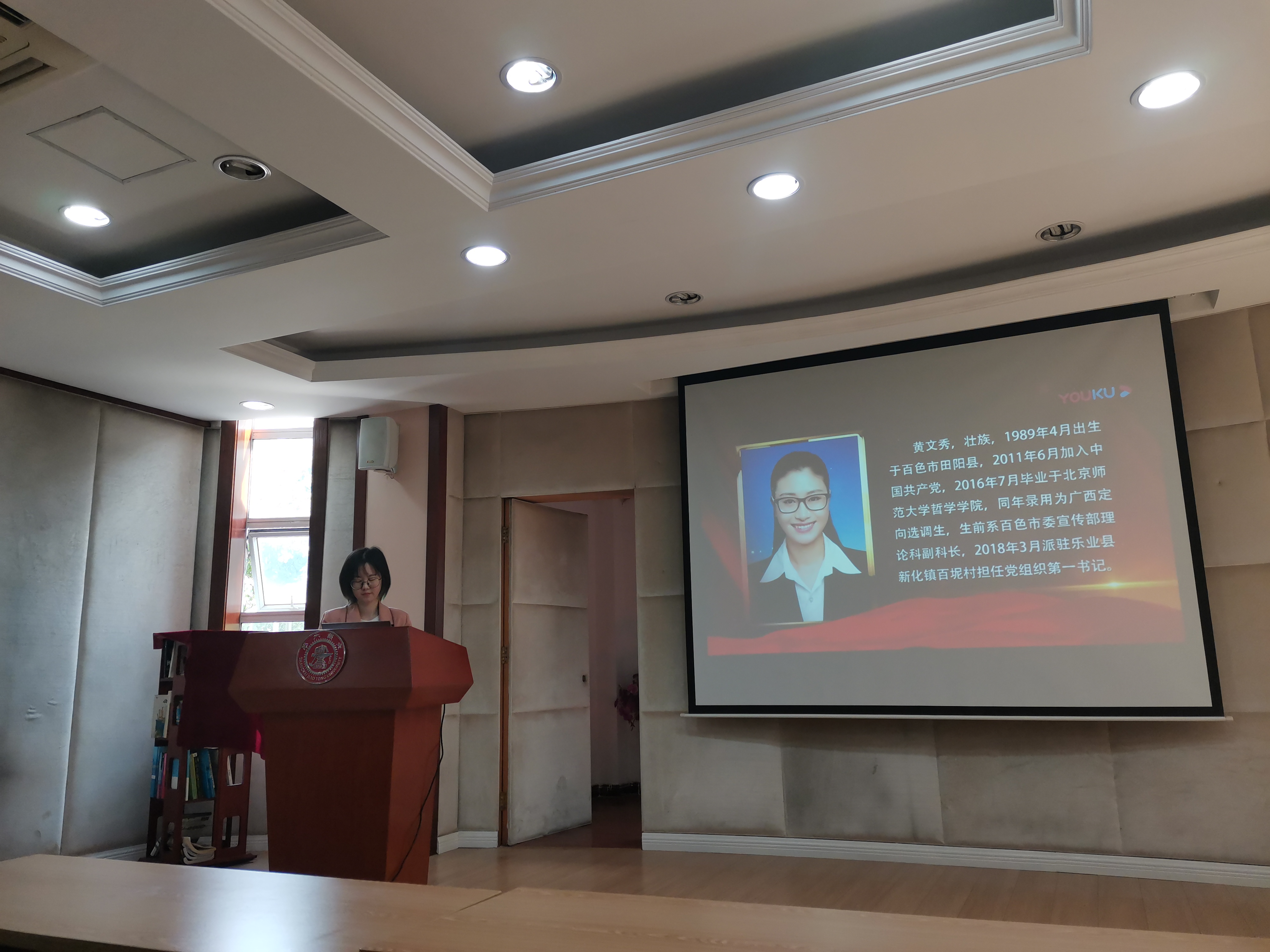 20级博士生党支部在学院二楼会议室开展学习黄文秀先进事迹专题学习会,支部党员及入党申请人共计18人参加了会议。支部预备党员魏琰同志对黄文秀同志简介、经历及所获荣誉等进行了介绍,而后播放观看了介绍黄文秀通知的先进事迹的视频。黄文秀同志研究生毕业后,放弃大城市的工作机会,毅然回到家乡,在脱贫攻坚第一线倾情投入、奉献自我,用美好青春诠释了共产党人的初心使命,谱写了新时代的青春之歌。