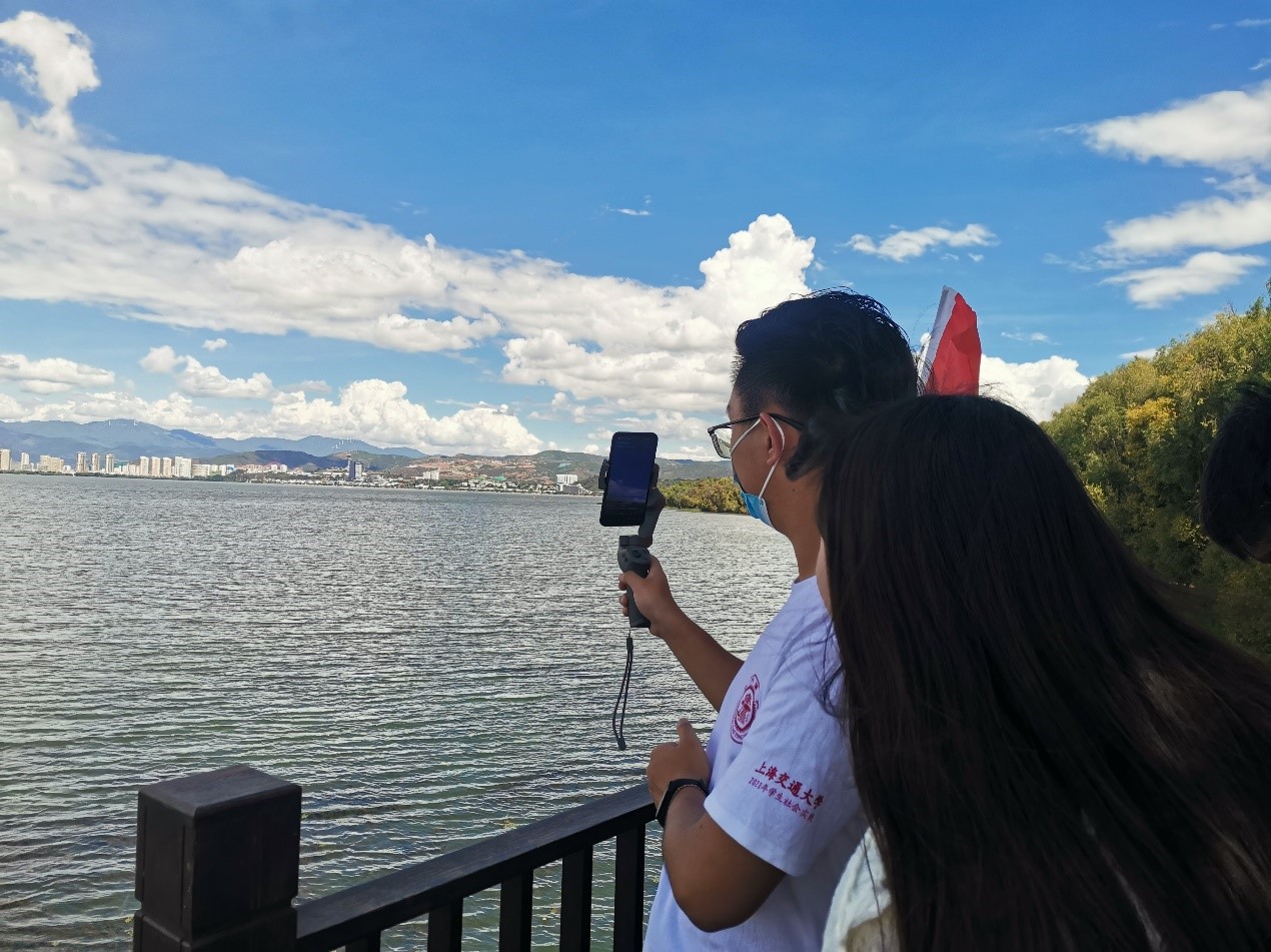 当日下午,实践团来到洱海生态廊道亲身体验洱海治理成果。洱海生态廊道,是环洱海流域湖滨缓冲带生态修复与湿地建设工程的简称,项目全长129公里,能有效削减入湖污染负荷、改善洱海水质,同时又兼具游憩功能。为让更多人了解洱海治理现状,实践团开启网络直播,让手机前的观众观看到洱海生态廊道如今的景象:小孩子在水边嬉戏,年轻人在自行车道骑行,新婚夫妇在草坪拍婚纱照,老年人坐在长椅上享受阳光。实践团介绍了实现生态廊道如今美景的一系列治理措施,包括790多公顷的生态修复和湿地建设,129公里的环湖生态廊道和若干环境监测站点,涉及23个村1806户居民的生态搬迁、30公里污水管网的完善和5个带有湿地修复功能的科研实验基地。本次长约2小时的直播,让817人次观众通过网络画面享受到洱海的碧水蓝天。