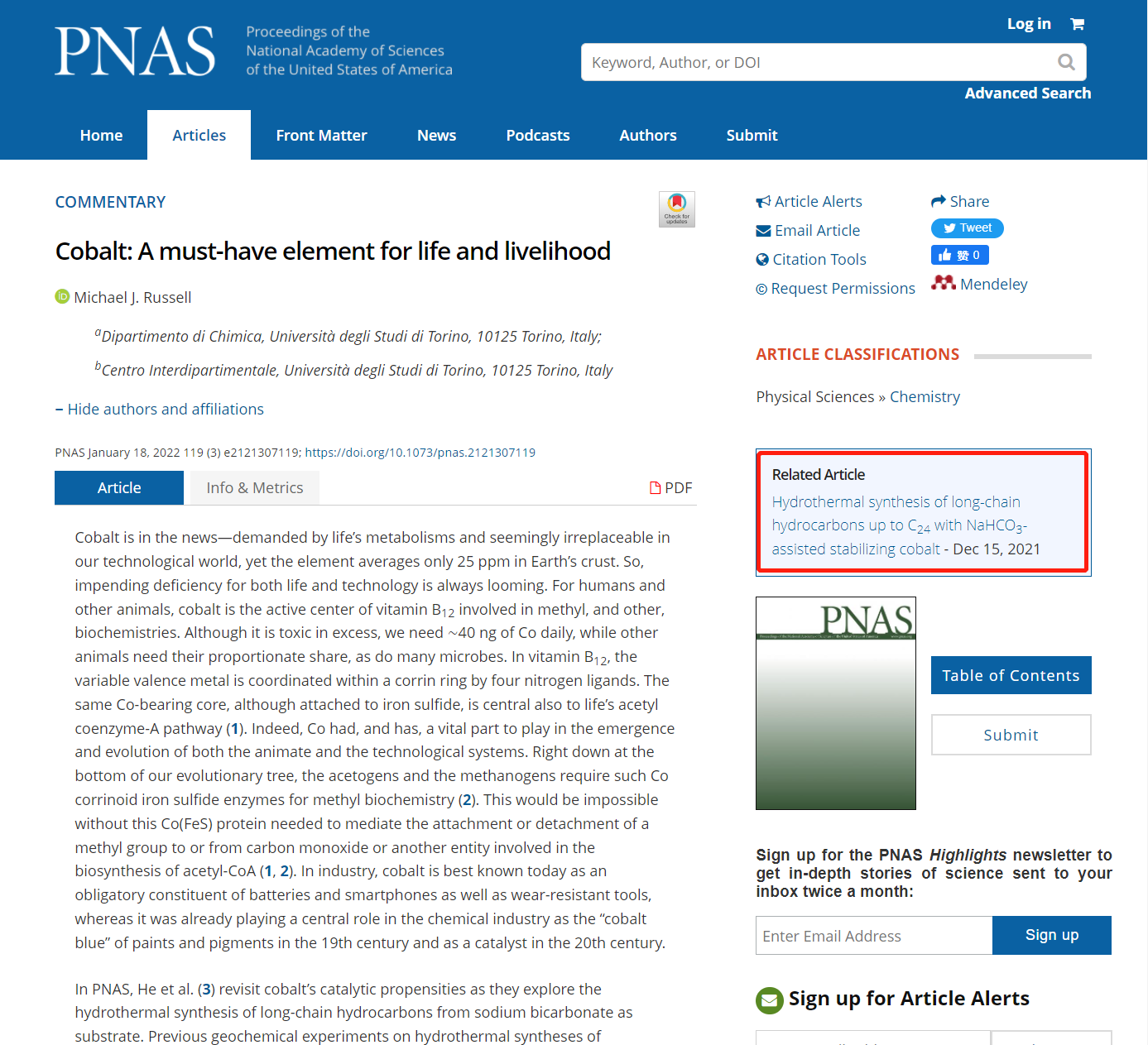 上月,香港AV 金放鸣教授研究团队在《美国科学院院刊》(Proceedings of the National Academy of Sciences of the United States of America,PNAS)发表了水热转化二氧化碳产长链烷烃的论文,并被PNAS选为热点评述文章。近日,国际著名的海底生命起源学说创始人Michael J. Russell教授在PNAS对该研究发表了题为“Cobalt: A must-have element for life and livelihood”的重要专评文章(//doi.org/10.1073/pnas.2121307119)。