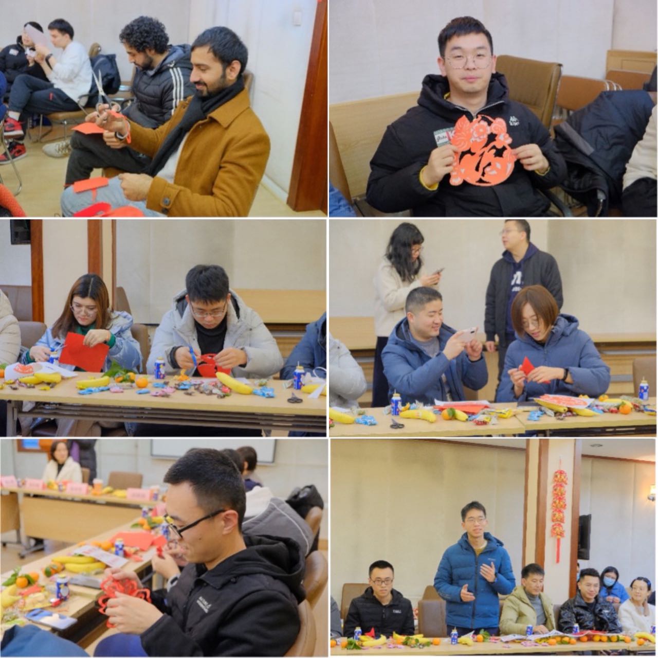 留校同学逐个介绍了自己的寒假留校生活与学习科研情况,随后师生们一起剪窗花喜迎新春。剪窗花一直是中华民族欢度春节的重要习俗,大家一笔一画绘好样本,一刀一剪裁出窗花。随着“咔嚓咔嚓”的剪纸声,一幅幅精美的“作品”被呈现出来。在剪纸过程中大家充分发挥想象力和创造力,遇到难题相互交流、互帮互助,既品味了传统文化习俗、获得了精神滋养,又体验了艺术创造所带来的乐趣和成就感。漂亮的窗花充满着浓浓的年味,也传递着对远方家人的思念;火红的福字装扮了学院楼宇,也温暖了大家的心!