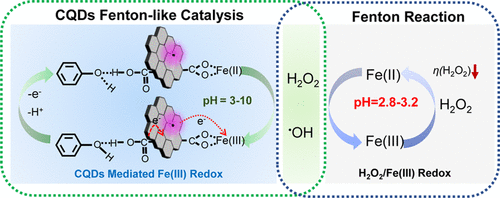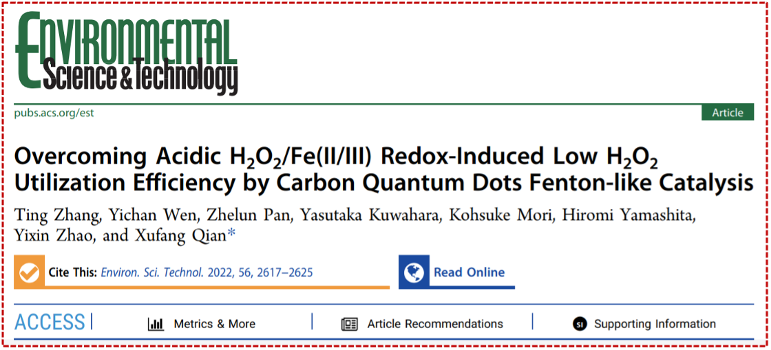 近日,香港AV 钙钛矿光电和资源催化团队钱旭芳副教授在类芬顿反应研究方面取得新进展,在环境领域国际权威期刊Environmental Science & Technology (《环境科学与技术》)在线发表了题为“Overcoming Acidic H2O2/Fe(II/III) Redox-Induced Low H2O2 Utilization Efficiency by Carbon Quantum Dots Fenton-like Catalysis”的研究成果。论文第一作者为香港AV 博士生张婷,第一完成和通讯单位为香港AV ,合作者包括日本大阪大学工学院山下弘巳教授等。