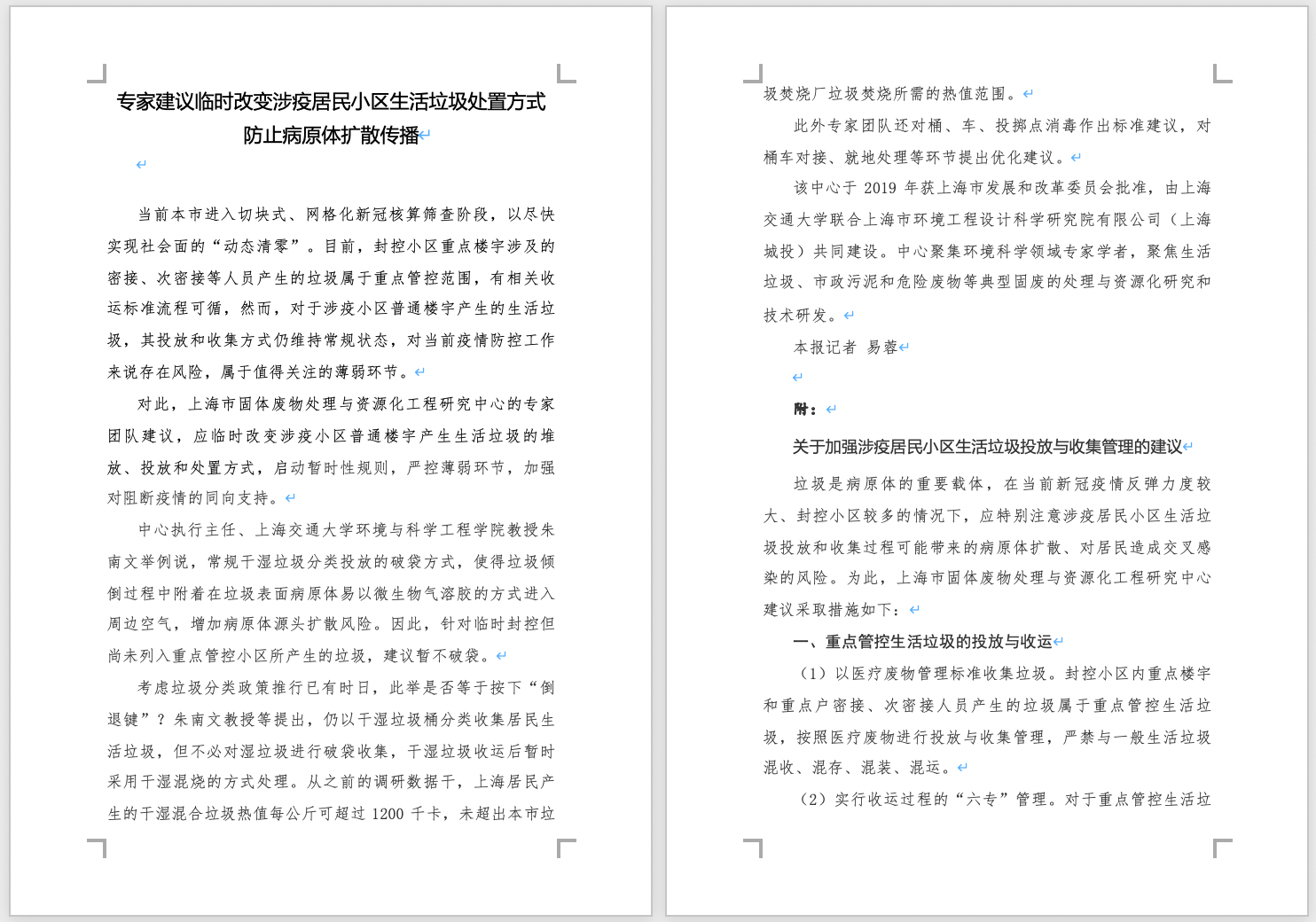 上海市固体废物处理与资源化工程研究中心执行主任、香港AV 教授朱南文针对如何临时改变涉疫居民小区生活垃圾处置方式、防止病原体扩散传播向上海市相关管理部门撰写了内参,同时为《文汇报》撰文,对如何改进涉疫居民小区生活垃圾投放与收集管理提供专家建议。
