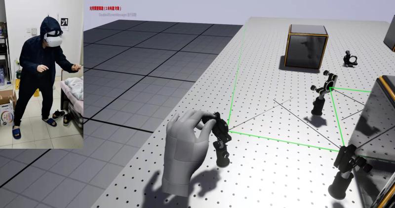 没有办法到实验室,怎样才能找到实验室操作的感觉呢?物理与天文学院的博士生严增泉想到,可以借助VR虚拟现实设备和“元宇宙”概念,在虚拟世界中映射实验设备,并通过体感手势交互实现对虚拟实验器件的调控,达到线上实验的目标。