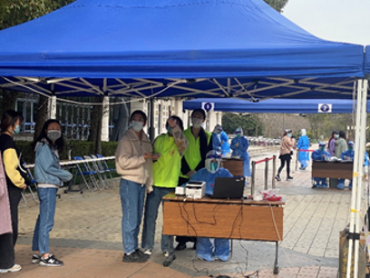 在核酸检测志愿服务中,支部党员樊林平、张博、罗颖、冯康宏、黄安华,查丽娜等同志在疫情初期人手严重不足时,主动参与到新图核酸检测志愿者服务,及时摸排密接人员,为控制疫情的发展作出巨大贡献。程勋强、陈佳斌、彭耀威、黄安华、谢智雄同志响应学校号召,甘冒感染风险,在防疫物资不足的情况下,做“最美的逆行者”,参与到密接和发热人员的核酸检测志愿者服务中。樊林平、金一卉同志在校内疫情稳定后,仍然奉献在第一线,化身“大白”,参与校内日常核酸检测志愿者服务。他们表示,核酸检测志愿者虽具有一定的危险性,但“甘愿奉献,不怕危险”是作为党员的使命和责任,希望能以实际行动践行“党员先上”的无畏精神,站好毕业季的“最后一班岗”!