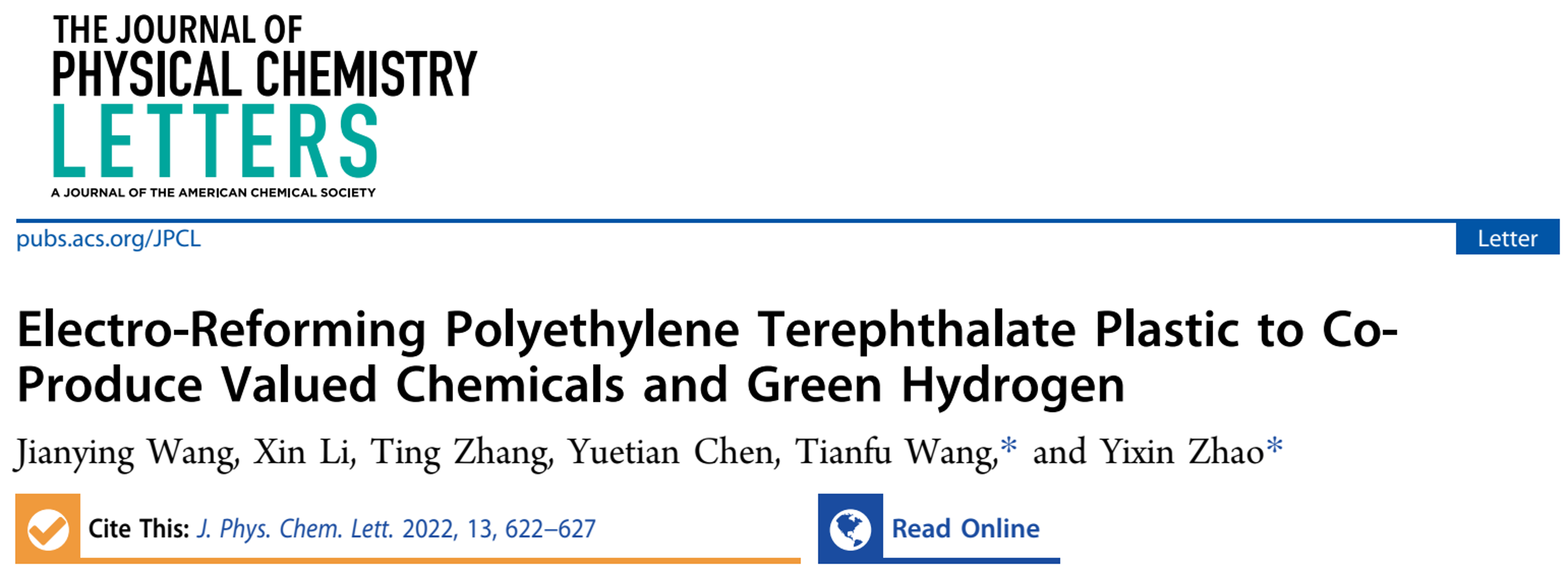 2. Wang, J. Y.; Li, X.; Zhang, T.; Chen, Y. T.; Wang, T. F.*; Zhao, Y. X.*; Electro-Reforming Polyethylene Terephthalate Plastic to Co-Produce Valued Chemicals and Green Hydrogen. J. Phys. Chem. Lett. 2022, 13, 622-627.
